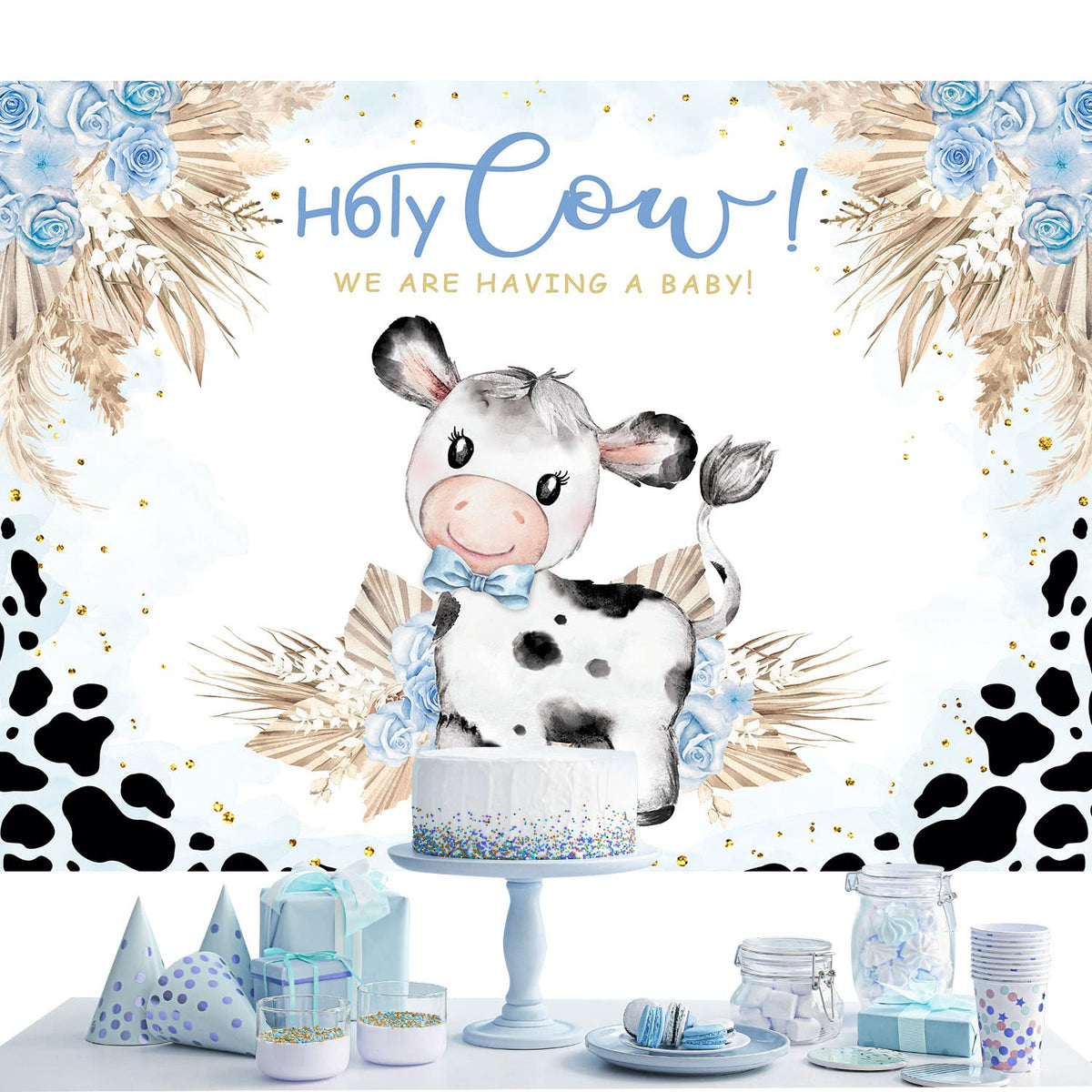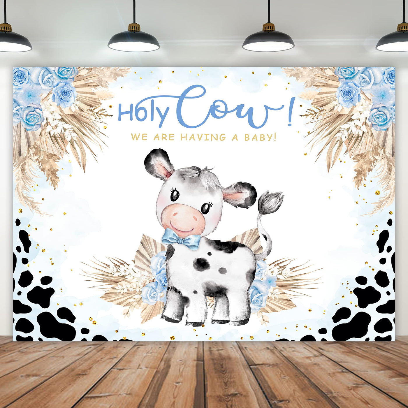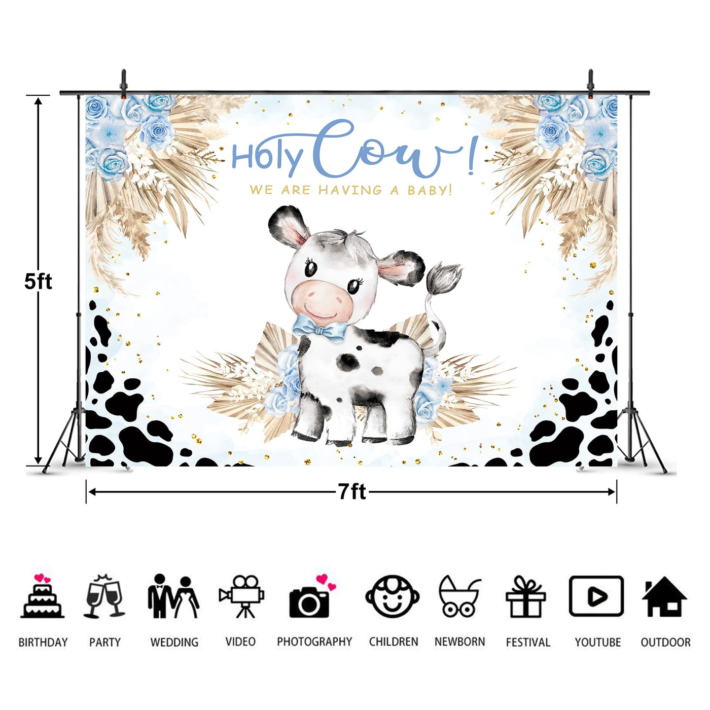 Imirell Holy Cow Baby Shower Backdrop 7Wx5H Feet Farm Blue Cow Print Boys Cowboy Floral Pampas Kids Polyester Fabric Newborn Bir