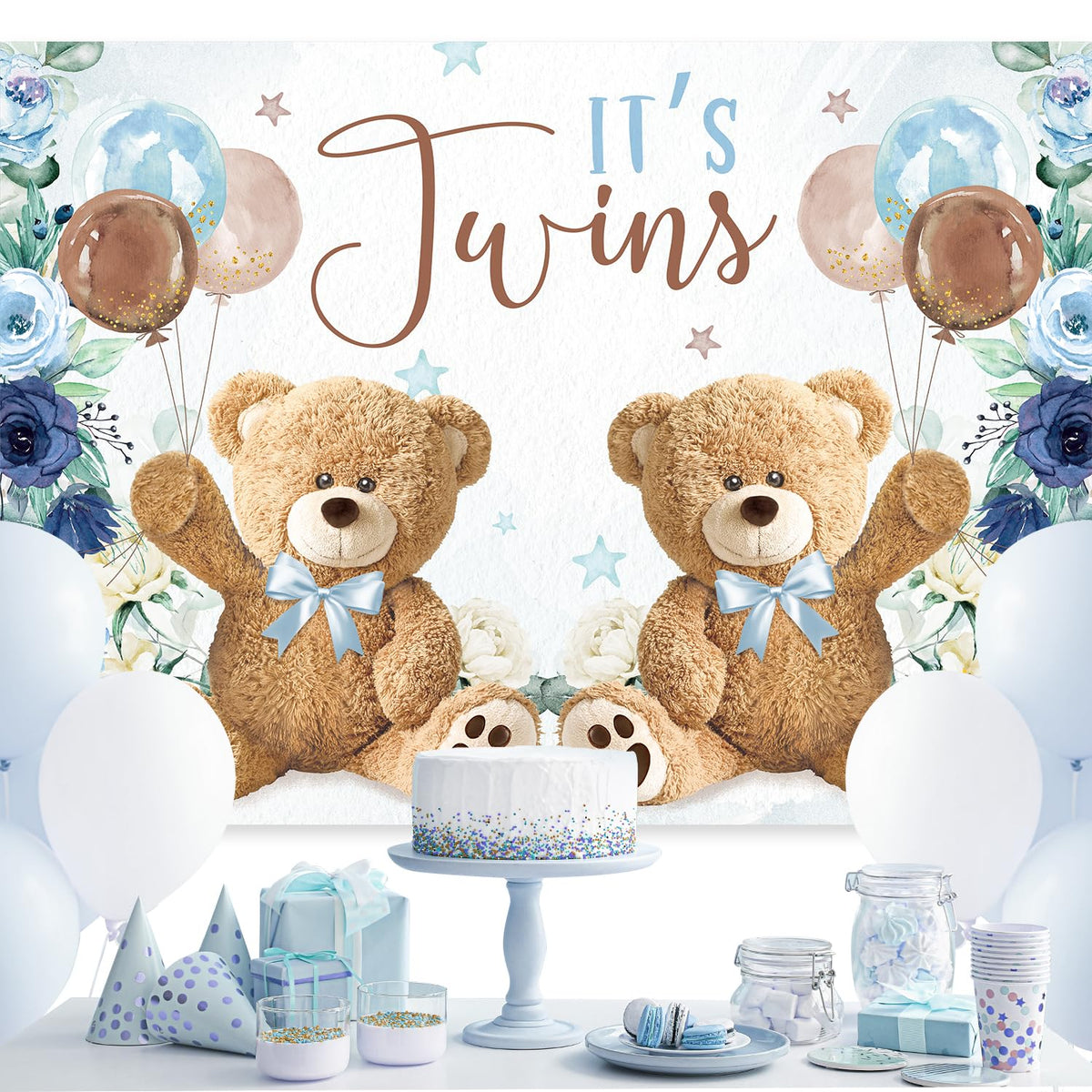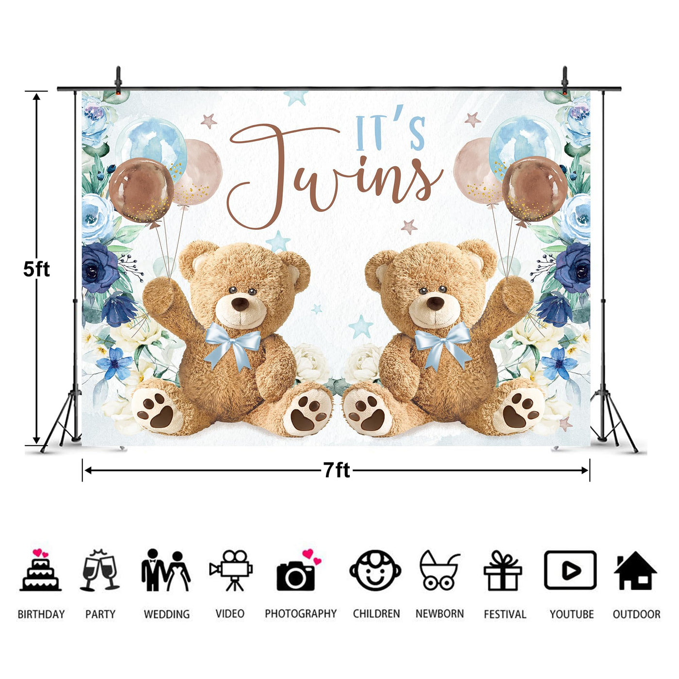 Imirell Twin Bear Boys Baby Shower Backdrop 7Wx5H Feet It'S Twins Boy Navy Blue Floral Brown Balloon Newborn Polyester Fabric Cu