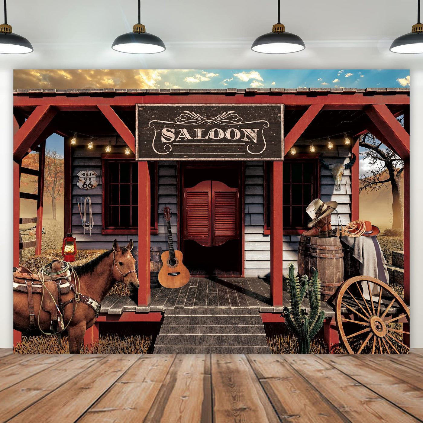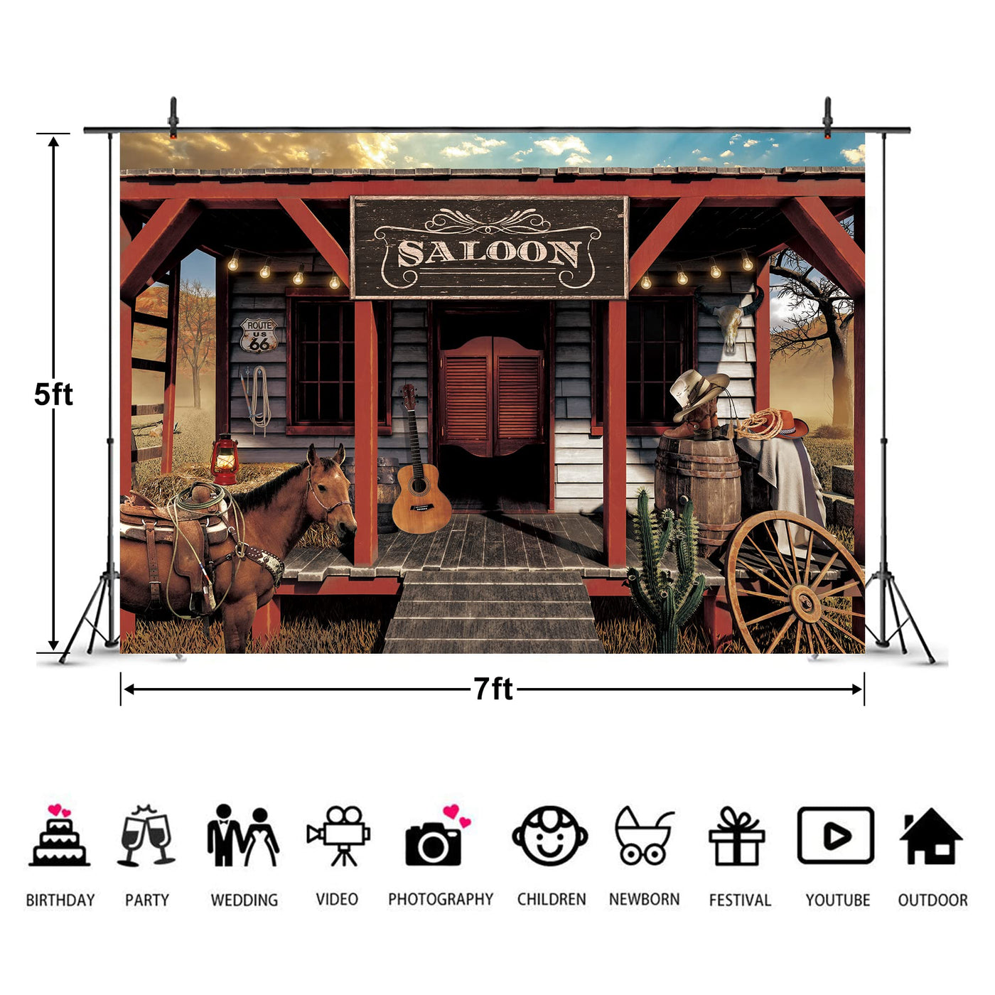 Q: What is the size of the Imirell Vintage Westen Cowboy Backdrop?A: The backdrop measures seven feet wide by five feet high. This size is ideal for various photography settings, providing ample space for subjects and props.
