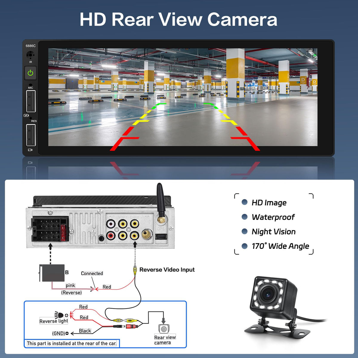 Package Includes: 1 X 6.86'' Single Din Car Stereo 1 X Power Cable 1 X Speaker Cable 1 X Backup Camera 1 X Remote Control 1 X External Microphone 1 X User Manual