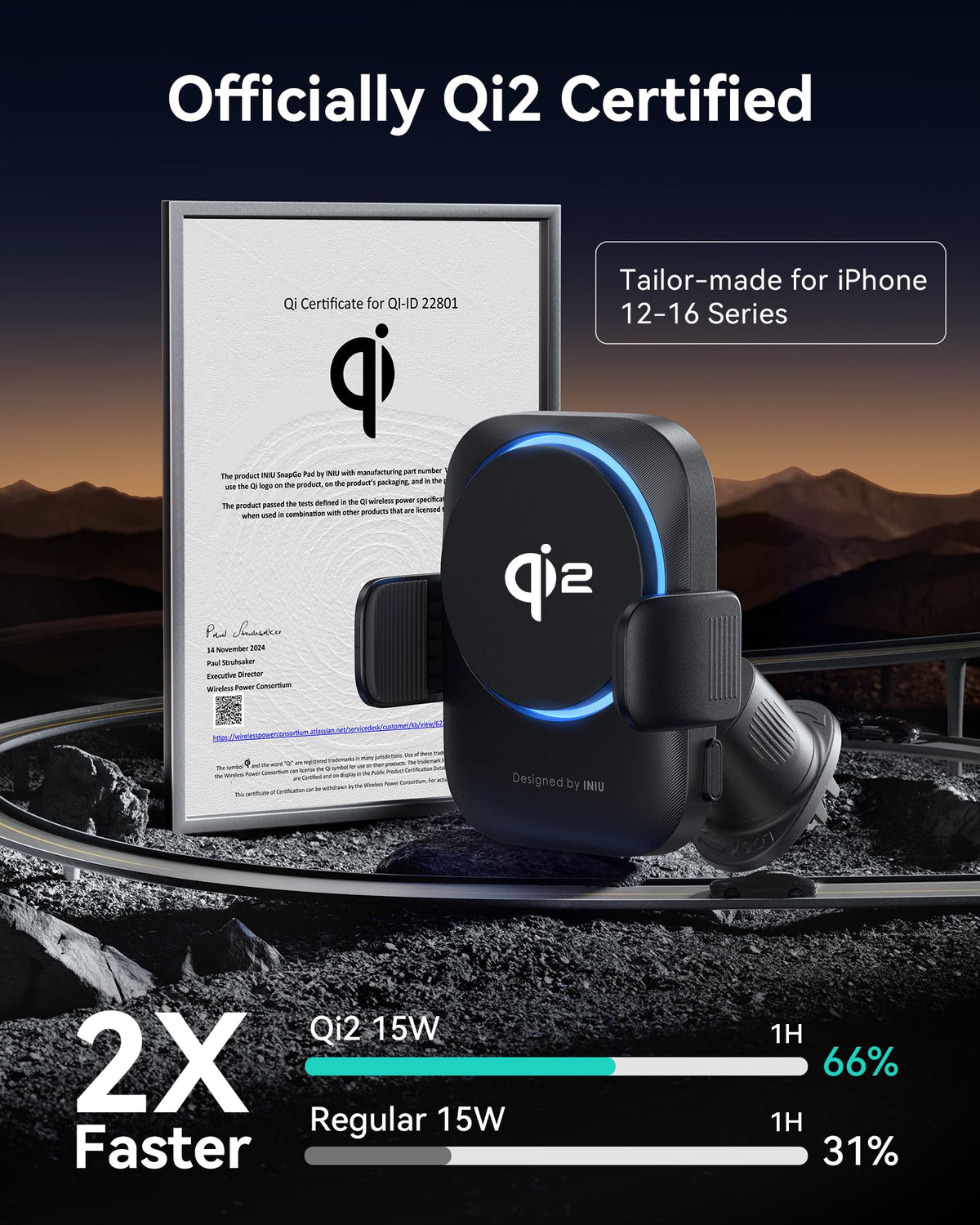 Iniu Qi2 Certified 15W Car Phone Holder Wireless Charger, Ultra-Stable 22N For Magsafe Car Mount Charger With Cooling Fins & Rgb