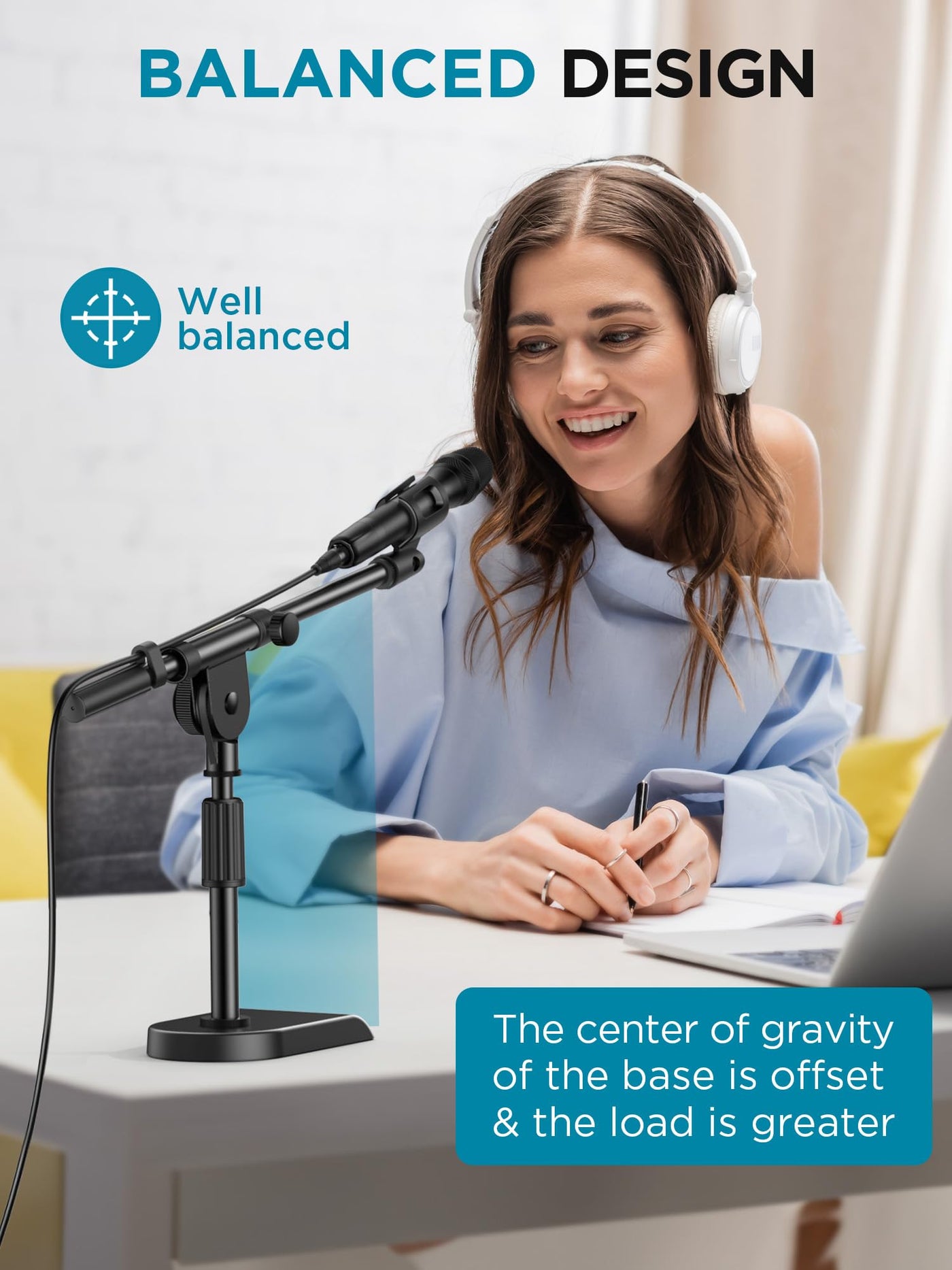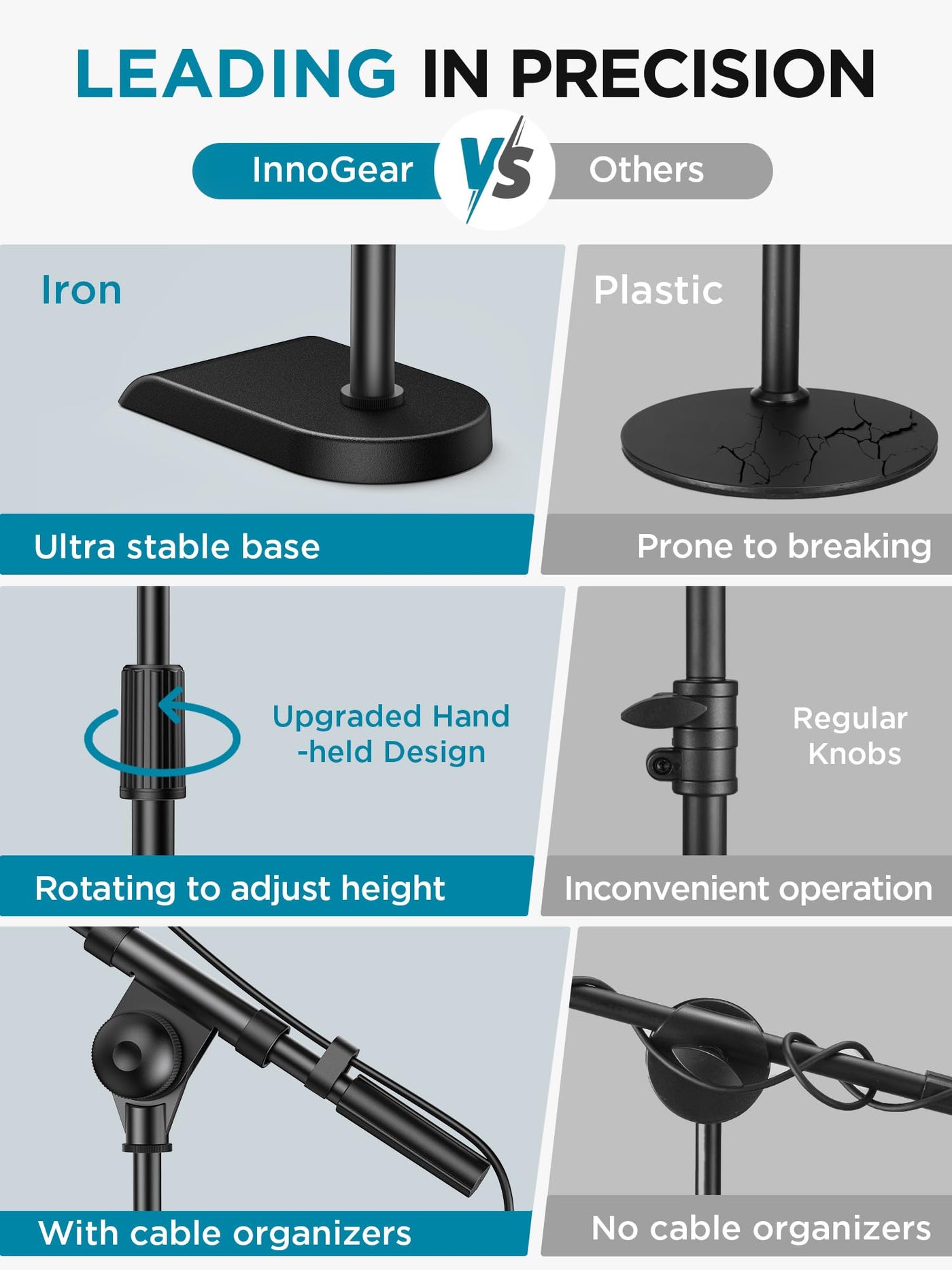 Innogear Heavy-Duty Desktop Microphone Stand Enhance Your Recording And Performance Setup With The Innogear Heavy-Duty Desktop Microphone Stand, Designed For Superior Stability And Versatility. The Stand Features A Heavy-Weighted, Powder-Coated Black Base With A Rubber Gasket To Absorb Vibrations, Ensuring Your Microphone Remains Steady And Balanced. Ideal For Kick Drum And Amp Mic Placements, This Stand Provides Unwavering Stability, Allowing You To Focus On Your Sound Without Worrying About Stand Wobble. The Extendable Boom Arm Offers Unparalleled Adjustability, Allowing You To Modify The Length And Angle For Perfect Microphone Positioning. Capable Of Supporting Up To 4.4 Lbs (2.0 Kg) When Extended Halfway, It Easily Handles Microphones Like The Blue Snowball And Blue Yeti. The Included 3/8 Female To 5/8 Male Screw Adapter Ensures Compatibility With A Wide Range Of Microphone Models. Additionally, The Stands Height Can Be Adjusted From 11 Inches To 15.8 Inches With A Reliable Clutch, Providing Maximum Comfort And Convenience Whether You Are Sitting Or Standing. Designed With Flexibility And Broad Compatibility, This Stand Is Perfect For Broadcasts, Podcasts, And Live Performances. It Can Also Be Used For Miking Guitar Amplifier Cabinets, Bass Guitar Amplifier Cabinets, Snare Or Tom Bottoms, Keyboard Amplifiers, Theater Productions, Boundary Miking, And More. Compatible With Microphones Like The Fifine K669B, Nw-700, Audio-Technica At2020, At2035, Razer Seiren X, And Shure Sm7B, The Innogear Stand Is An Indispensable Tool For Any Audio Setup, Blending Stability With Versatility For Professional And Enthusiast Use Alike.
