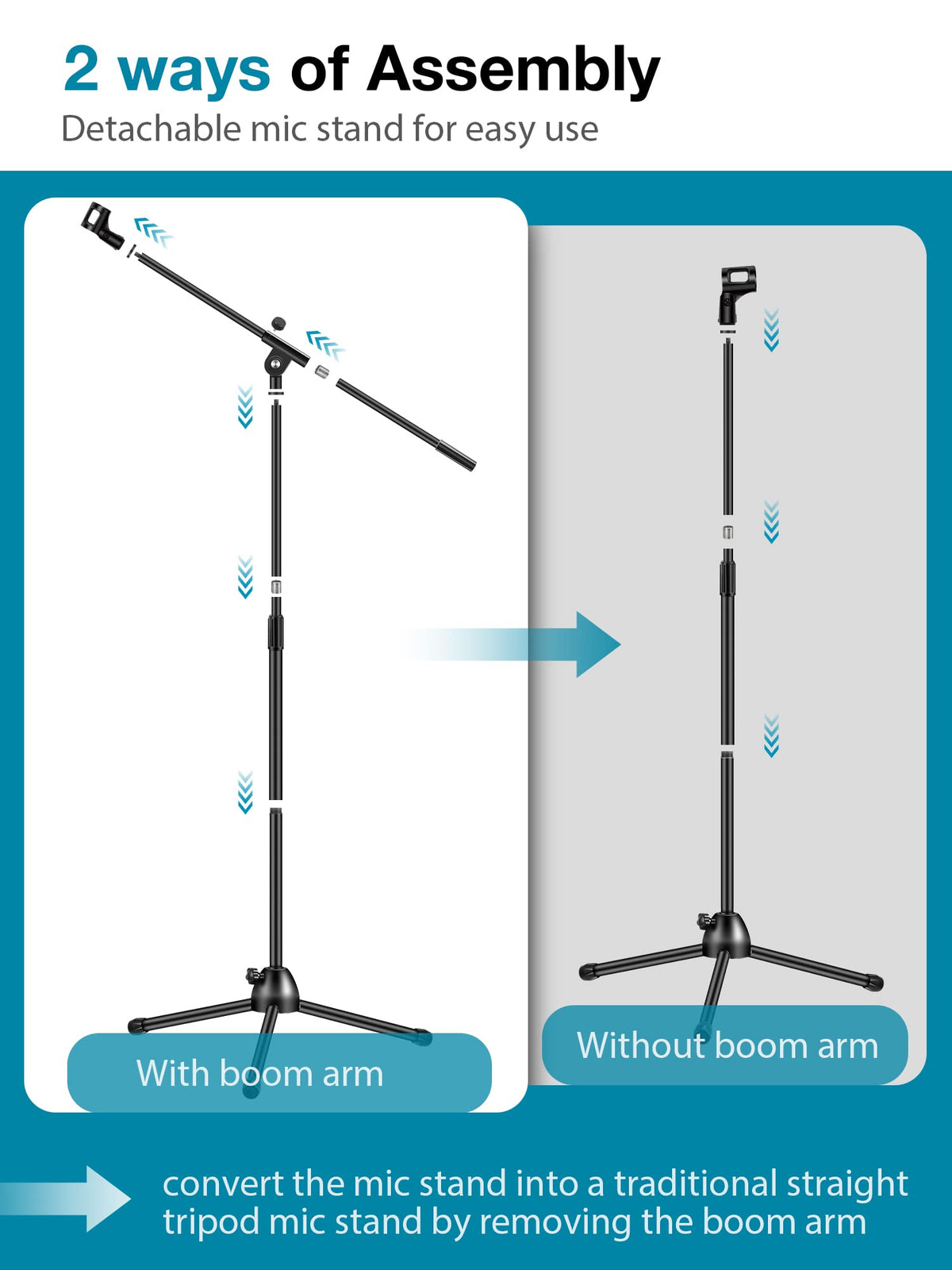 Innogear Microphone Stand, Detachable Tripod Boom Stand Height Adjustable Heavy Duty Mic Boom Stand With 2 Mic Clip Holders And Metal Base For Singing, Speech, Stage, Wedding, Outdoor Activities