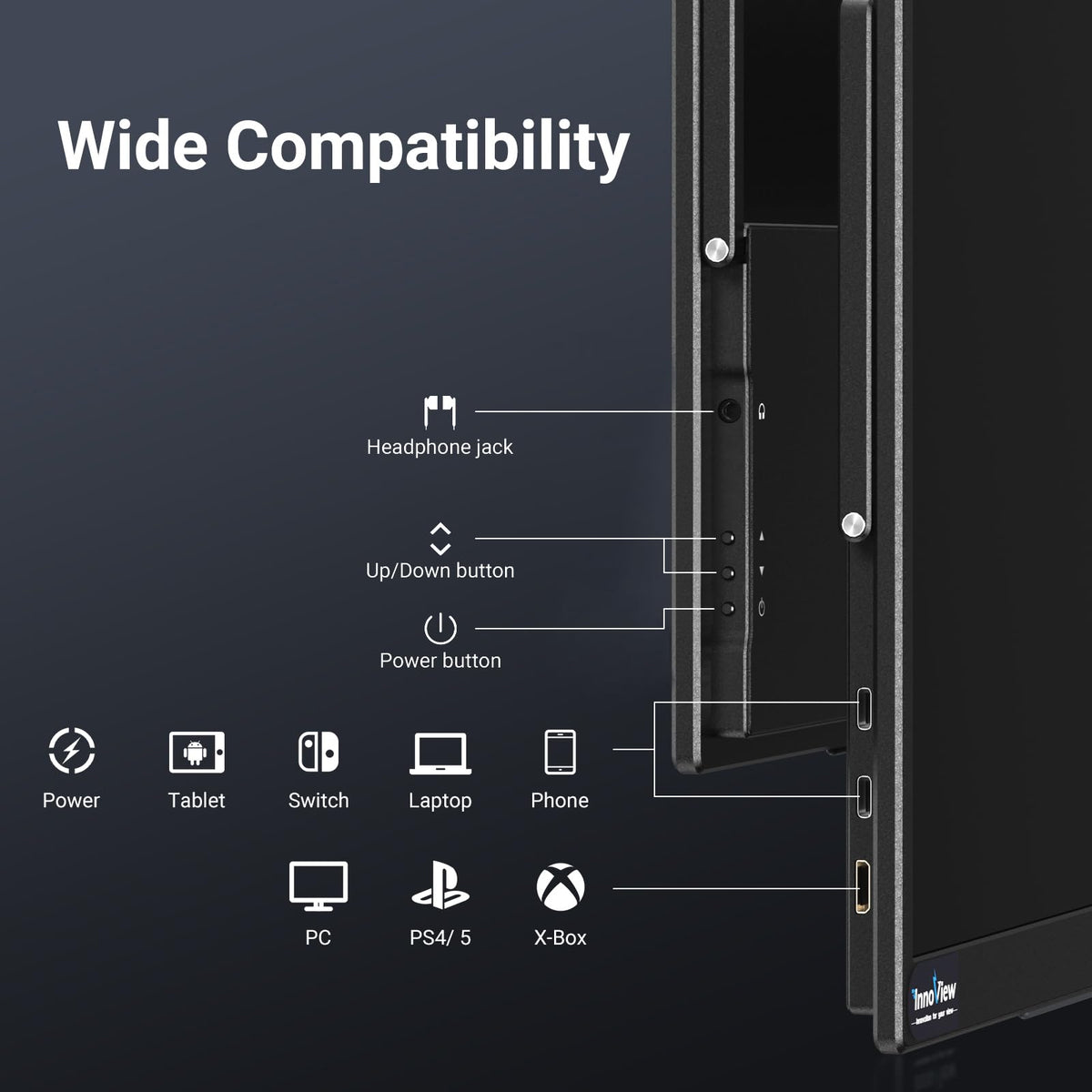 Q: What devices are compatible with the InnoView Portable Monitor?A: The InnoView Portable Monitor is compatible with a wide range of devices, including MacBook, Surface, laptops, PCs, Xbox, Nintendo Switch, and PS4/5. It features 2 USB-C ports and 1 HDMI port for easy connectivity.