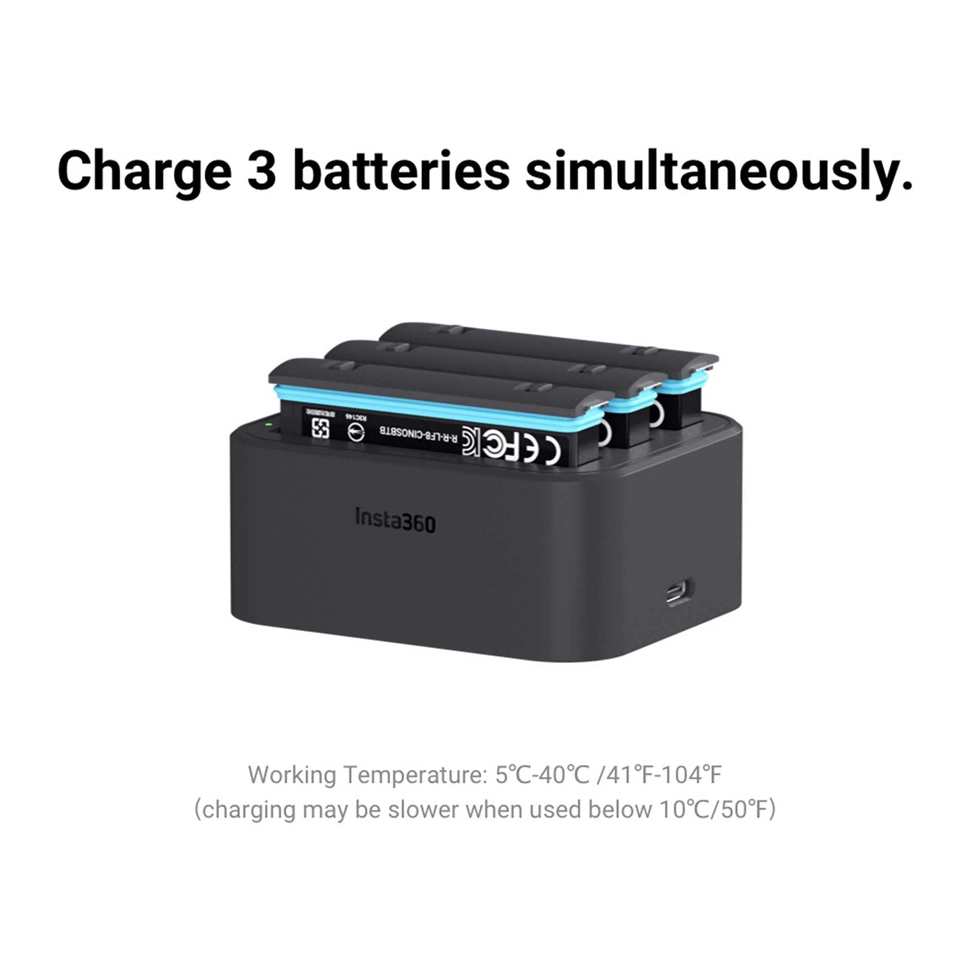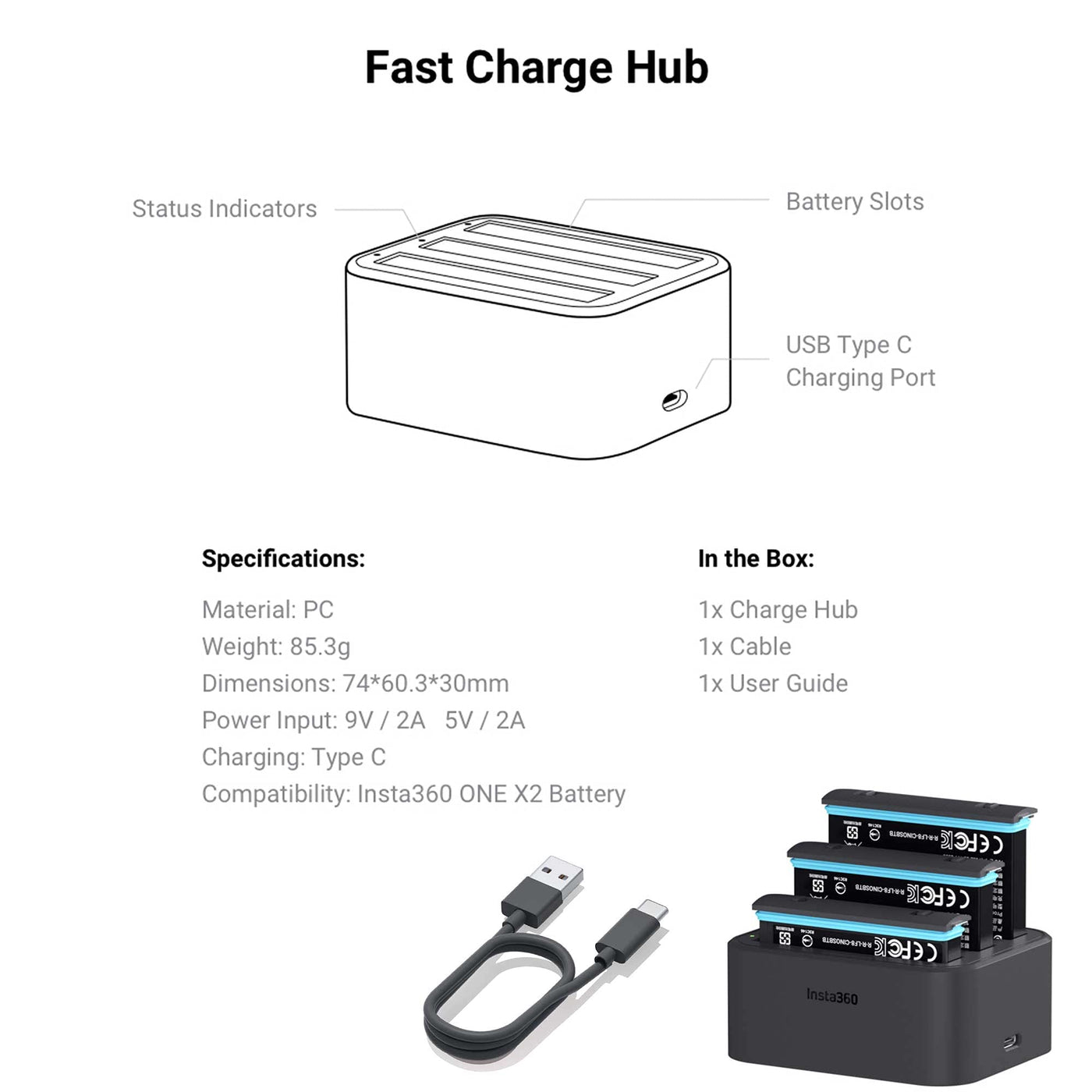 Insta360 One X2 Battery &Amp; Fast Charge Hub Bundlethe Insta360 Fast Charge Hub Is A Triple Bay Charger Designed Specifically For Insta360 One X2 Batteries. This Charger Can Charge (1) One, Two (2) Or Three (3) Batteries Simultaneously (X2 Faster Charge Than Charging Through The Camera). With An Integrated Smart Charging Circuit, This Charger Automatically Optimizing The Charging Sequence When More Than One Battery Is Connected.&Nbsp;The Indicator Lights On The Fast Charge Hub Will Flash Red/Green Once The Hub Is Connected To Usb Type-C Charging Cable And Plugged Into A Compatible Wall Adapter (Usb Wall Adapter Sold Separate - 2A Rated Adapter Required).&Nbsp;When The Battery Is Inserted Into The Slot The Charger Will Then Analyze The Battery And Illuminate Red During The Charging Sequence. Once The Charge Is Complete The Indicator Light Will Illuminate Green.&Nbsp;Fast Charge Hub Specificationinputusb-C Smart Charging 9V/2A *Or* 5V/2Acharging Portusb Type-Cworking Temperature41 Degree F To 104 Degree F (5 Degree C To 5 Degree C)Compatible Devicescharges Up To X3 Insta360 One X2 Batteries&Nbsp;Battery Base Specificationsrated Voltage: &Nbsp; 3.85Vmax Charge:&Nbsp; &Nbsp; &Nbsp; 4.4Vrated Power: &Nbsp; &Nbsp; 1630Mah / 6.27Whin The Box:(1) Fast Charge Hub For Insta360 One X2(2) Insta360 Batteries 1630Mah For One X2 Camerax1 - Usb Type-C Charging Cable (30 Length)X1 - User Manual