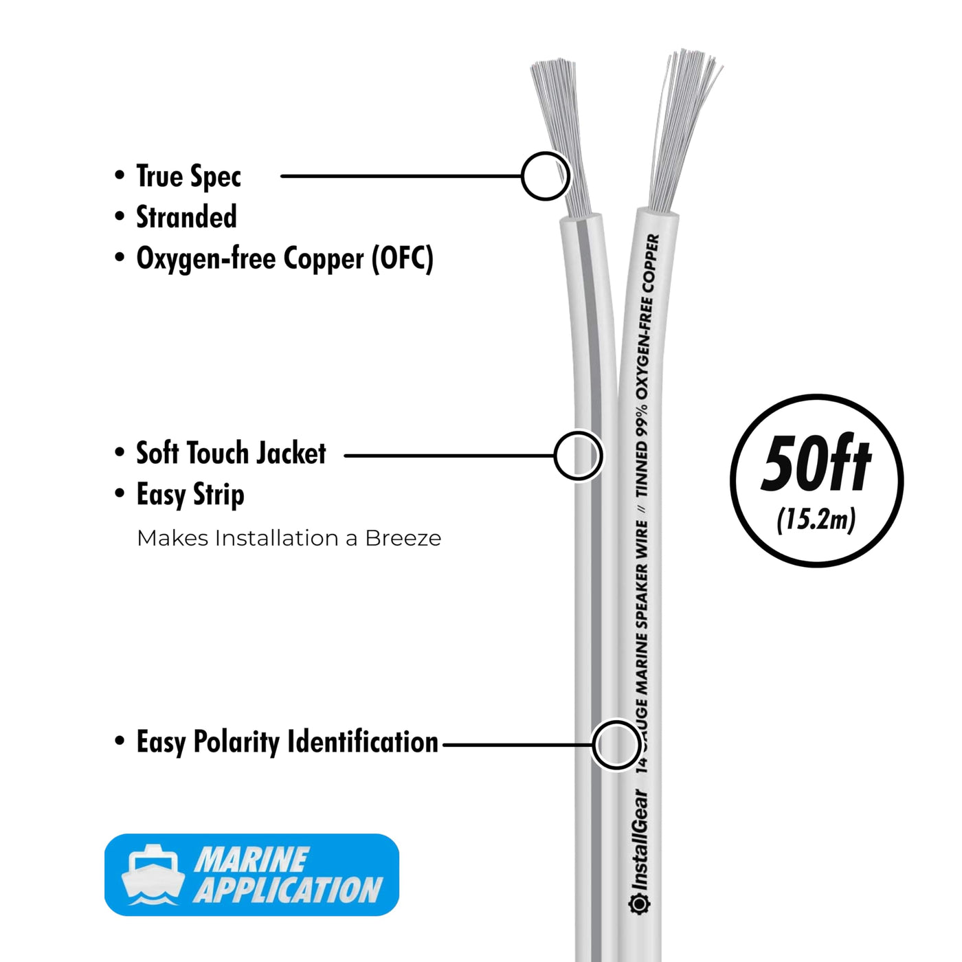 Q: What length does the InstallGear marine speaker wire come in, and how can I use it effectively?A: The InstallGear marine speaker wire comes in a length of 50 feet (15.2 meters), making it suitable for various installation needs. To use it effectively, consider the distance between your audio components and ensure proper routing to minimize resistance and maintain sound quality.