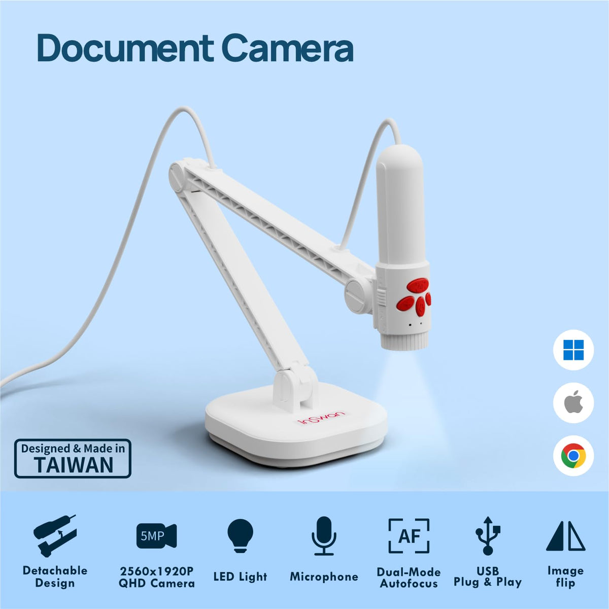 Inswan Usb Document Camera - High Definition, Autofocus, Built-In Led, Mic, Mac,Windows,Chromebook Compatible For Remote Teaching, Web Conferencing, Live Demo, Iwbs