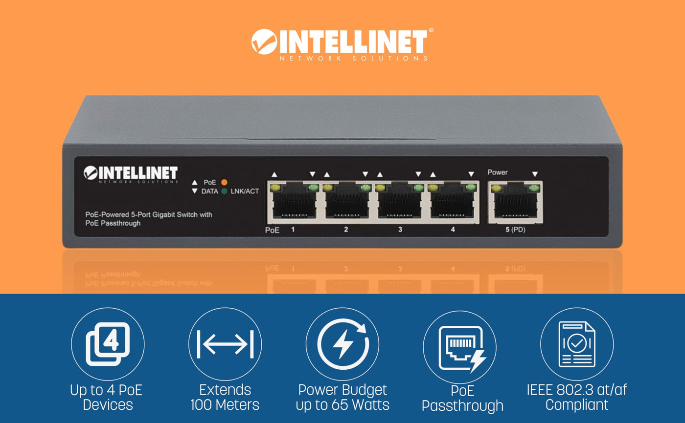 Intellinet Poe++ Powered 5 Port Gigabit Ethernet Switch With Poe Passthrough - 65W Power Budget Via Ac Power & 95W Power Budget