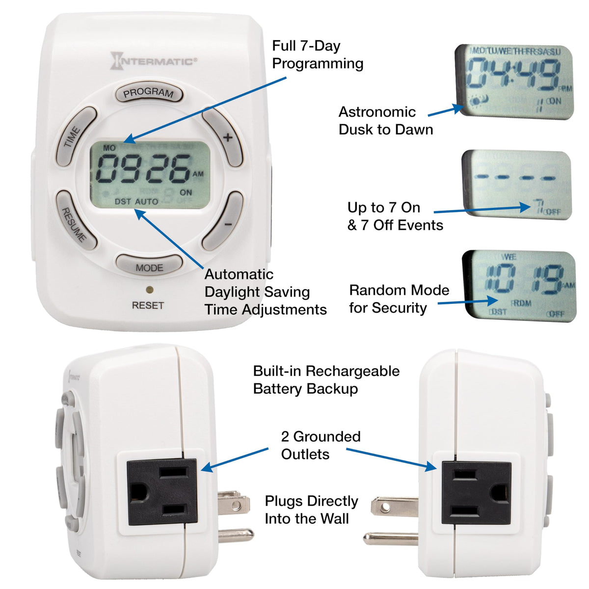 The Dt122K Heavy Duty Indoor 7-Day Digital Plug-In Timer Can Be Used For 24-Hour Or 7-Day Programming. It Allows For Up To 7 On/Off Programmed Events. This Timer Utilizes An Astronomic Feature To Keep Track Of Daily Sunrise/Sunset Changes And Automatic Daylight Saving Time Adjustment. The Random Feature Will Vary The Time Your Lights Turn On By A Few Minutes To Give Your Home A ''Lived In'' Look. It Has Two Grounded Receptacles. Includes A Built-In Rechargeable Lithium Ion Battery With A Minimum 7-Day Life To Retain Date And Time. Programs Will Not Be Lost In The Event Of A Power Failure. This Plug-In Timer Is Suitable For Use With Indoor Christmas Tree Lights Or Seasonal Decorations That Require An On/Off Schedule. Ul Listed. 15A, 125Vac, 60Hz.