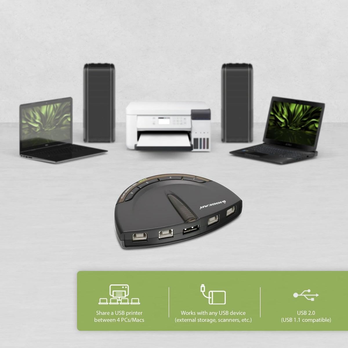 Iogears Usb 2. 0 Automatic Printer Switch Allows Four Pcs And / Or Macs To Share One Printer Or Multi-Function Printer. Simply Submit A Print Job And The Printer Automatically* Switches To The Preferred Computer. The Switch Also Enables Four Computers To Easily Share One External Hard Drive, Scanner, Or Any Usb Device. No More Plugging And Unplugging Between Computers. * Automatic Switch Function Is Software Based And Only Available With Usb Printer Or The Printer Function Of A Multi-Function Printer. For Connecting And Using Other Types Of Usb Devices, You Can Switch By Using The Push-Button On The Usb Switch Or With The Included Software.