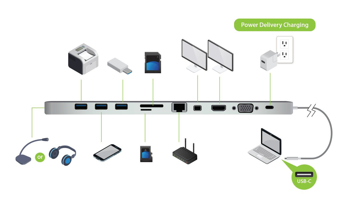 Turn Your Laptop Into A Complete Workstation The Perfect Companion To Your Usb-C Laptop And Turn It Into A Complete Workstation. Weather You Are On-The-Go Or Docking At A Workstation, This Ultra-Slim Docking Station Works As Hard As You Do. With Its Stylish Design, It Will Seamlessly Fit Into Your Setup. Now You Can Easily Add A Full-Sized Keyboard And Mouse, External Hard Drives, Printers, Webcams By Connecting Only One Cable To Your Setup.10 Ports Of Freedomconnect Up To 10 Devices Effortlessly To Your Laptop With A Single Usb-C Cable. This Docking Station Is Equipped With Memory Card Readers For Sd/Mmc/Microsd Memory Cards For Quick Access To Your Data. With Three Usb 3.0 (Type-A) Ports, You Can Connect An Array Of Usb Type-A Peripherals. With The Quick Charge Usb Port, You Can Charge Your Phone Or Tablet At Super-Fast Rates. With The Included Gigabit Ethernet Power, You Can Connect To Your Lan For Robust Data Bandwidth And Increased Security. On Top Of All This Connectivity, This Docking Station Also Offers The Flexibility Of 3 Video Connectivity Options: Hdmi, Mini Displayport And Vga. You Can Also Connect A Headset Or Microphone To Complete Your Multimedia Workstation Setup.Unravel The Remarkable Visual Experience Of 4K Ultra Hd (Uhd), At 4 Times The Resolution Of Standard Hd. The Dual Video Monitor Functionality Provides Astonishing Video Quality That Will Please Your Eyes And Provide A Higher Level Of Enjoyment From Watching Videos, Playing Video Games, Working And Creating From Your Home Office. Further More, You Can Get Full 1080P Hd Quality Video When Using A Dual Monitor Setup.Adding Two Monitors To Your Laptop Will Improve Your Productivity And Allow You To Get More Done. Mirror Or Extend Your Windows Usb-C Laptop To Two Monitors Or Extend Your Macbook Or Usb-C Apple Laptop To One Additional Monitor. Browse The Web On One Screen, Edit A Document On A Second. When Using A Windows Usb-C Laptop, Write An Email Or Connect To A Webinar On A Third Monitor.Charge Your Laptop While Connected To Your Docking Station Without The Need To Buy An Additional Power Supply. Connect Your Manufacturers Usb-C Ac Power Adapter Directly To The Docking Station And Power Your Laptop While You Work Or Play. With Up To 60W Of Power Delivery Pass Through, You Can Keep All Your Power-Hungry Devices And Peripherals Ready To Go. When You Are On-The-Go, This Bus-Powered Docking Station Does Not Need A Power Supply To Connect Your Devices.Sleek And Innovative Designthis Versatile And Innovative Dock Design Fits Seamlessly Into Any Workstation Or Setup. The Intelligently Contoured Design Provides The Best Ergonomic Typing Experience For Your Laptop. Save Space On Your Desk By Placing Your Laptop Directly On Top Of The Docking Station Or Display The Dock Next To Your Monitors For A Sleek, Minimalist Workstation.