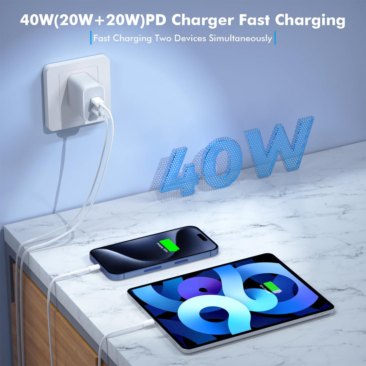 Iphone 15 Charger,Apple Charger Fast Charging,2Pack 40W Dual Port Power Delivery Apple Charging Block,2Pack 6Ft Usb C To C Fast Charger Cable,Usb C Charger For Iphone 15/15 Pro/Ipad Pro/Ipad Air/Mini