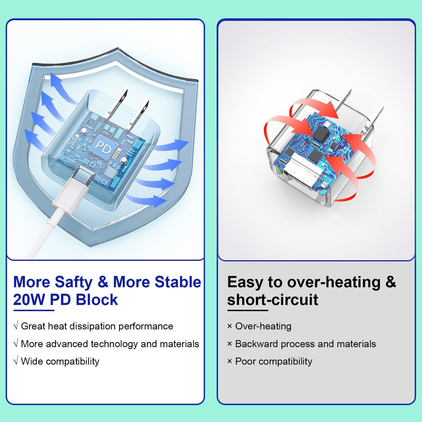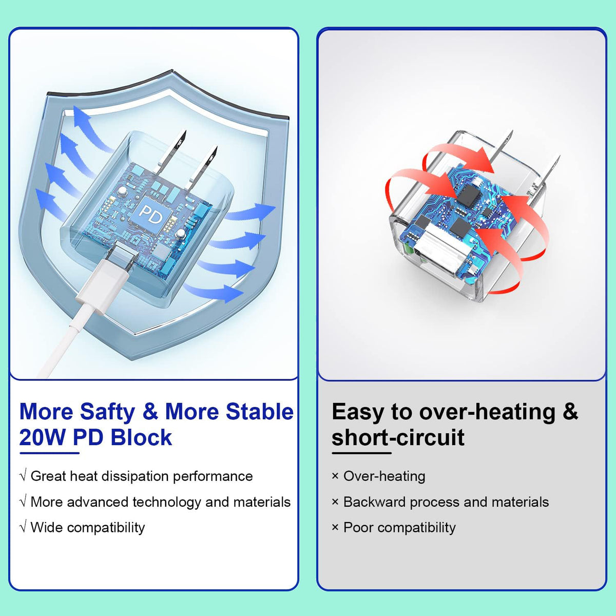 Q: What features ensure the safety of my devices while charging?A: The charger is equipped with a built-in high-tech chip that protects against overcurrent, over-voltage, short-circuit, and overheating. These features ensure safe and efficient charging while maximizing the lifespan of your devices.