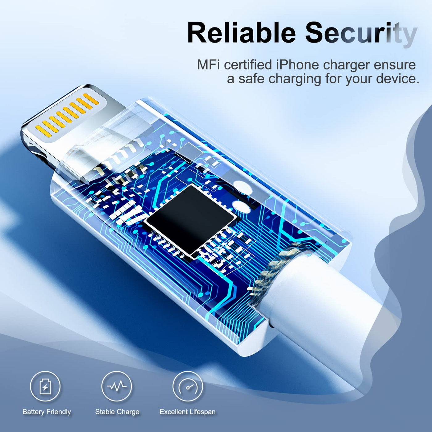 Q: How long is the iPhone Charger and what is included in the package?A: The iPhone Charger measures 6 feet in length, providing extra reach for convenience. The package includes three Lightning cables, making it easy to charge multiple devices in different locations.
