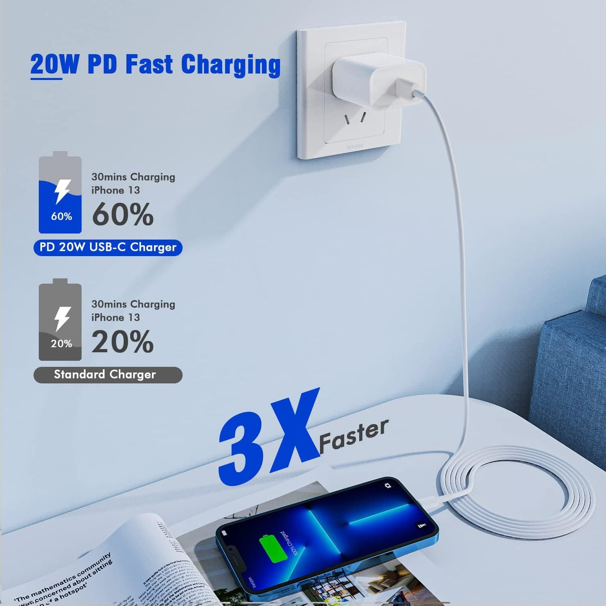 Q: How fast does the iPhone Fast Charger charge my device?A: This charger can provide a maximum output of 20W, allowing you to charge your iPhone 13 or 14 up to 50% in just 30 minutes. This is approximately 3X faster than standard chargers, ensuring you spend less time waiting for your device to charge.