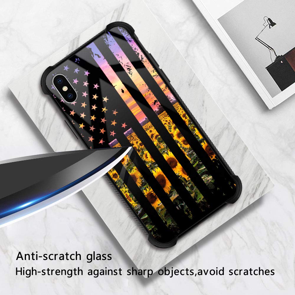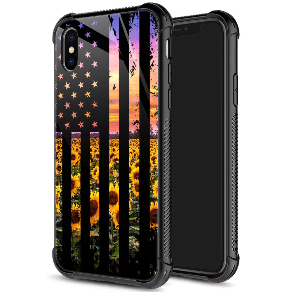 Iphone Xs Case,9H Tempered Glass Iphone X Cases For Girls Women, Flag Sunflowers Pattern Shockproof Anti Scratch Case For Apple