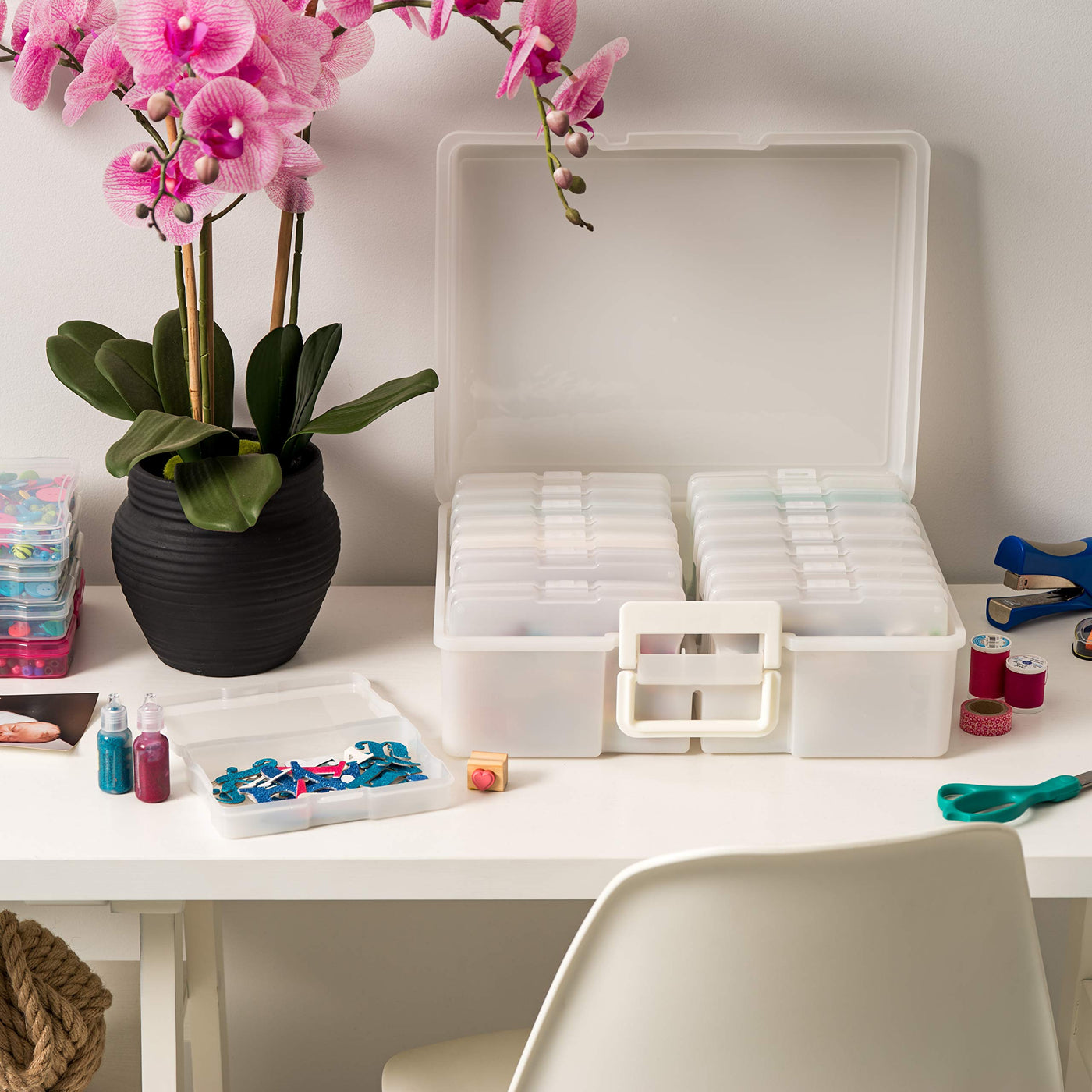 Q: What material is the IRIS USA Photo Storage Craft Keeper made from?A: This product is made from durable plastic, ensuring that your items are protected and organized effectively.
