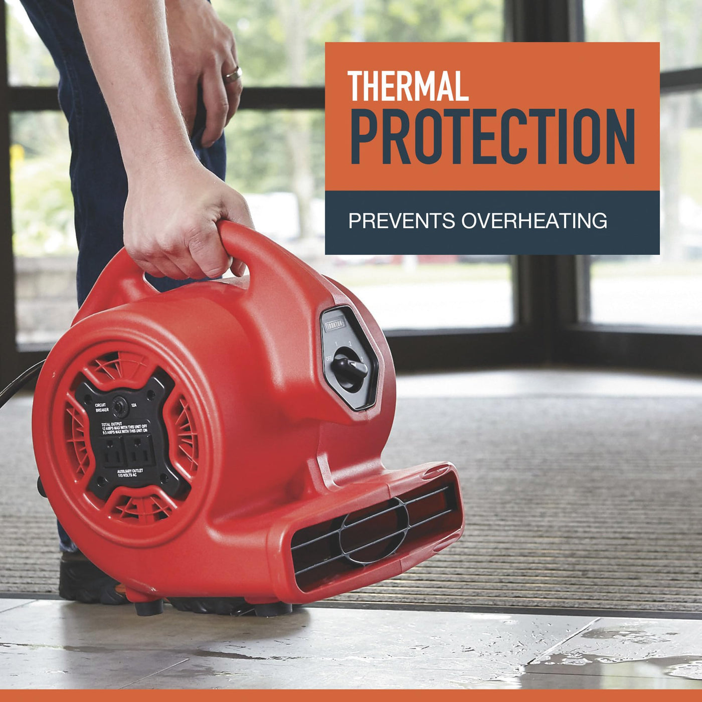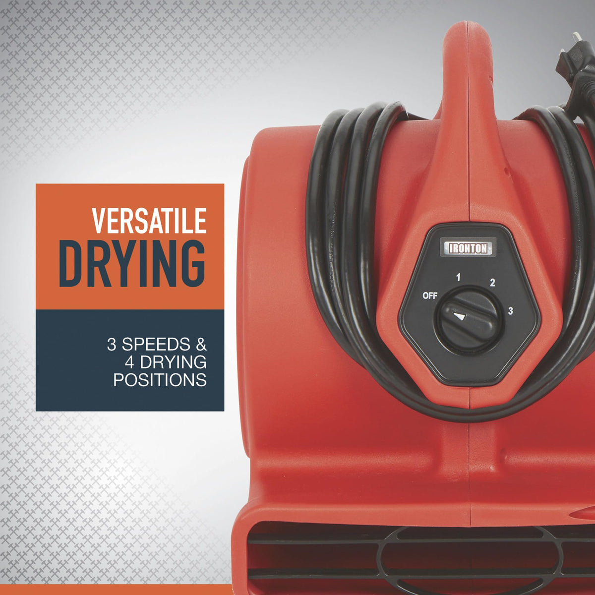 This Ironton Mini Air Mover Carpet/Floor Blower With Built-In Outlet Is A Lightweight, Compact Unit Perfect For Drying Hard-To-Reach Areas Such As Crawl Spaces, Inside Cabinets And Under Counters In Addition To Carpets, Floors, Walls And Ceilings. The Blower Features A Powerful, Energy-Efficient 1/8 Hp Induction Motor That Generates 500 Cfm Yet Uses Only 1.5 Amps/115 Volts. 3 Speeds And 4 Drying Positions (0, 20, 45 And 90) Provide Maximum Flexibility. Durable Injection-Molded Polypropylene Plastic Body Is Made To Last. Built-In Outlet Allows For Daisy Chain Connection With The Other Blowers. Dual Thermal Protection Prevents Overheating. 10Ft. Wraparound Cord; Stackable (Up To 4 Units) For Easy Storage. 6-1/2In. Fan Dia; 10-11/16In.L X 12-5/32In.W X 13-1/8In.H.