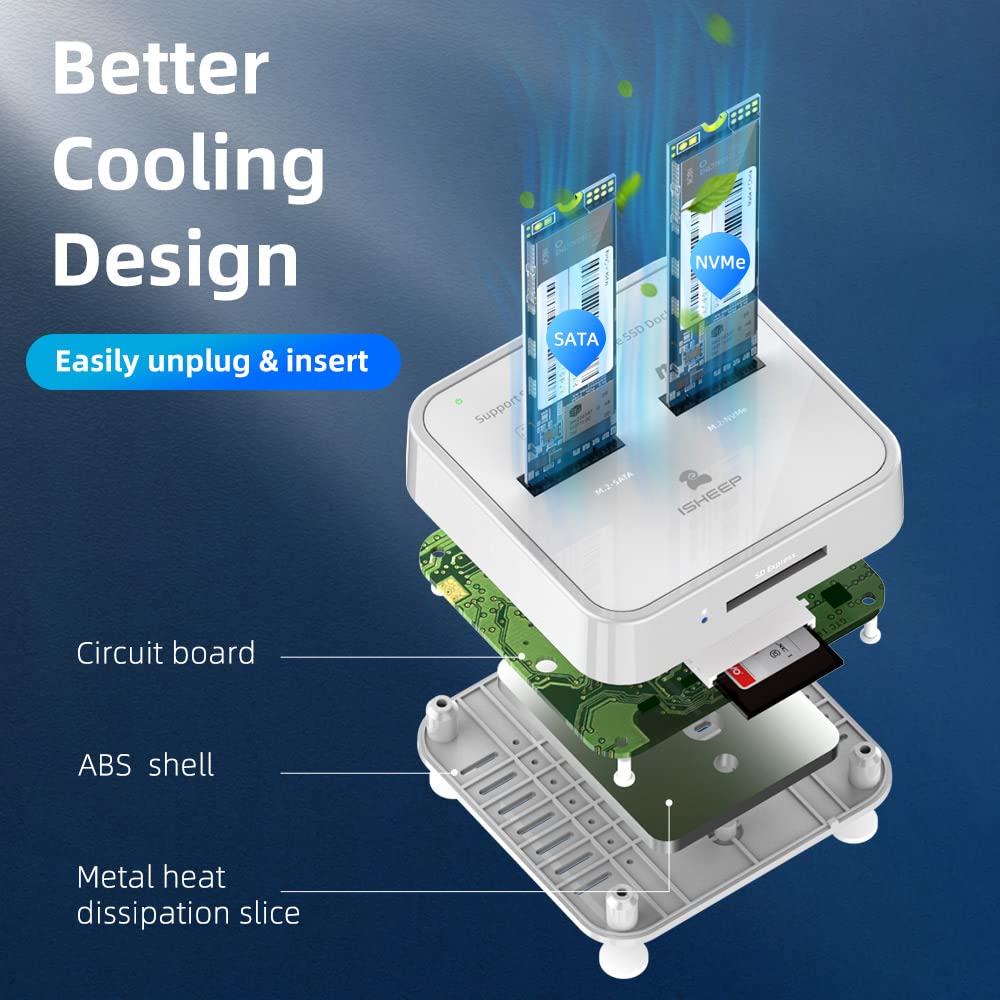 Isheep M.2 Nvme/Sata Docking Station(No Clone Function) It Is Easy To Use, Easy To Carry, And Takes Up Little Space. M.2 Sata Hdd Port*1/ M.2 Nvme Hdd Port*1/ Sd Express Card Port*1. Support 3 Different Types Of Hard Disks To Read At The Same Time. Usb3.2 Gen2 Interface, 10Gbps Transmission Speed. Hard Disk Docking Station Is Equipped With C To C Cable, A To C Cable. Operating System Compatibility: Windows, Macos, And Linux. Led Indicator:Led Indicator Lets You Know The Working Status Easily. Energy Supply:The 5V-3A Power Adapter , Guaranteed With A Stable And Reliable Energy Supply For Massive Data Transfer. Efficient Heat Dissipation:Vertical Design Of Solid State Hard Drive Box Base ,Fast Heat Dissipation, Better Protection Of Hard Disk, Effectively Extend The Lifetime Of Ssd. More Stable Placement:Bottom Cooling Hole Design Equipped With Non-Slip Silicone Pad To Be More Stable On The Table. Warm Tips: This Hard Drive Docking Station Does Not Have Clone Function,Supports Reading 3 Different Hard Drives At The Same Time.(M.2 Sata Ssd /M.2 Nvme Ssd /Sdexpress 7.0/7.1). Please Confirm The Hard Disk Type Corresponding To The Product Port. For The Brand New Ssd Drive, It May Not Find The Drive, Because The Brand New Ssd Drive Should Be Formatted Before First Time Using. And Also Need To Make The Ssd Drive Partition. If You Need To Take Out The Ssd, Please Pull Out The Power First, And Then Take Out The Ssd.