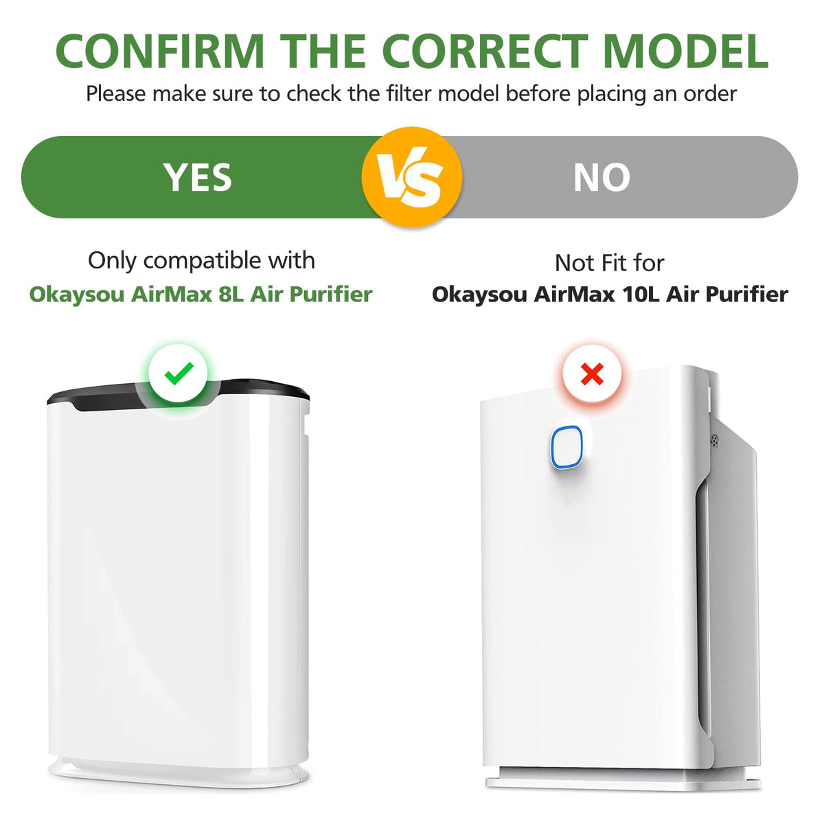 Isinlive Replacement Compatible With Okaysou Airmax 8L Replacement Filter, 3-In-1 System &Nbsp; Filter Set Compatible With Okaysou Airmax 8L Air Puri-Fier. &Nbsp; &Nbsp;&Nbsp;Package Include: 1 X H13 Hepa Filter:&Nbsp;H: 13.8'' X L: 9.4'' X W: 1.2'' 1 X Activated Carbon Filter:&Nbsp;H: 13.8'' X L: 9.4'' X 0.4'' &Nbsp;Note: This Is Not Oem Product. Okaysou Brand Names And Logos Are The Registered Trademarks Of Their Respective Owners. Any Using Okaysou Airmax Brand Name Or Model Designation For This Product Is Made Solely For Purposes Of Demonstrating Compatibility.&Nbsp; &Nbsp; For Optimum Performance, It Is Recommended To Replace The Filter Every 6 Months. Note: Please Remove The Plastic Bags Before Using.
