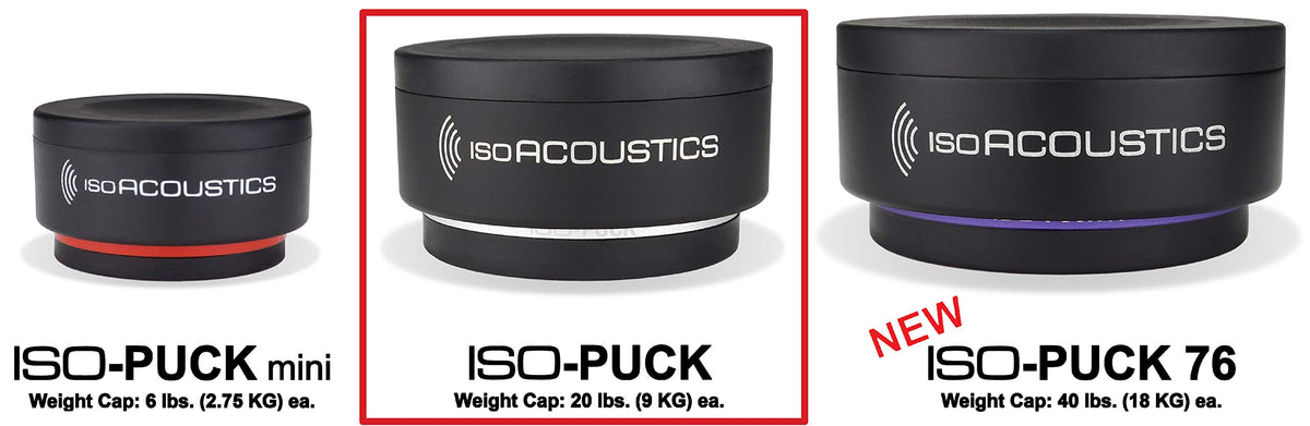 Isoacoustics Iso-Pucks Provide An Innovative Approach To Isolating Studio Monitors, Speakers And Subwoofers. The Unique Patented Design Provides A High Degree Of Isolation While Resisting Lateral Movement And Oscillations, Which Results In Greater Sound Clarity And Focus. The Iso-Puck Has A Weight Capacity Of 20 Lbs (9 Kg) Per Unit. The Iso-Puck Can Isolate A Speaker That Is 60 Lbs When Using 3 Units, Or Up To 80 Lbs Using 4 Units.