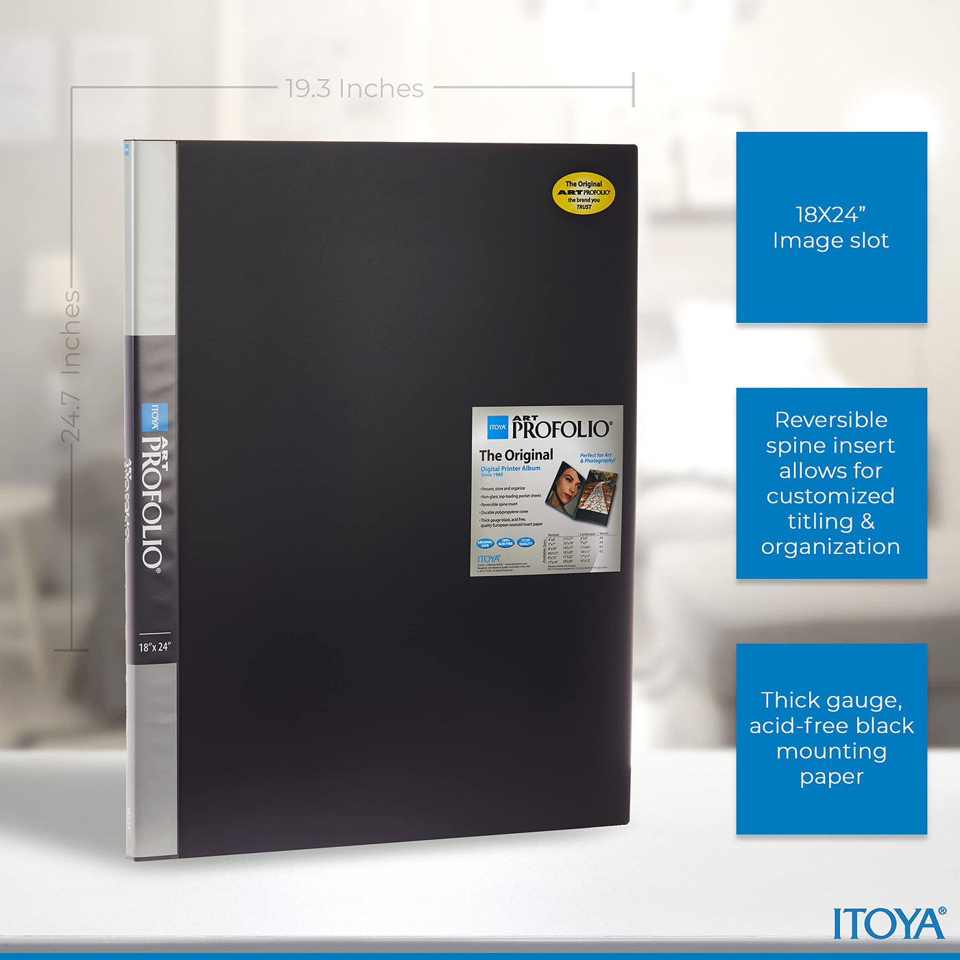 Q: What is the size of the Itoya Art Profolio Storage Display Book?A: The Itoya Art Profolio Storage Display Book measures 18 inches by 24 inches, making it ideal for storing large photographs and artwork.