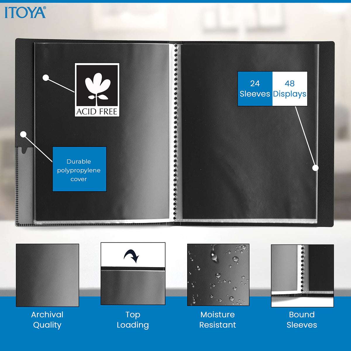 Q: How many pages does the Itoya Art Profolio contain?A: This storage/display book includes 24 pages, allowing for 48 views, which provides ample space for showcasing your artwork, photographs, and scrapbooking materials.