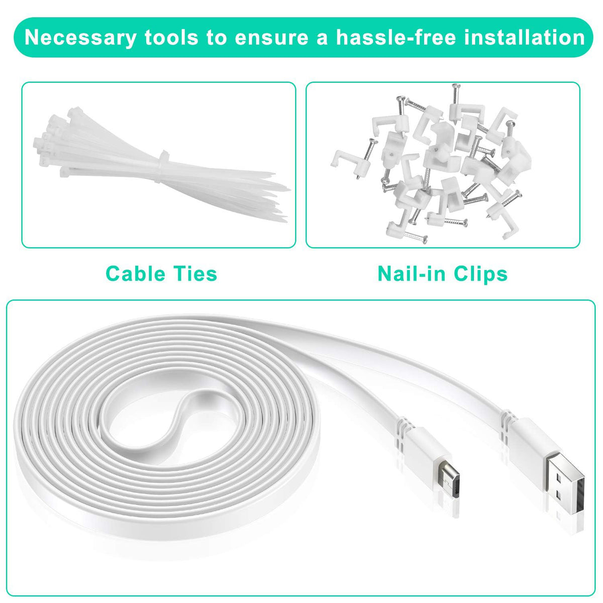 Q: What installation accessories are included with the Itramax Micro USB Cable?A: The Itramax Micro USB Cable comes with enclosed nail-in clips and ties, which facilitate easy arrangement of the cable along walls. This helps to keep your installation neat and prevents the cable from disrupting your home's decor.