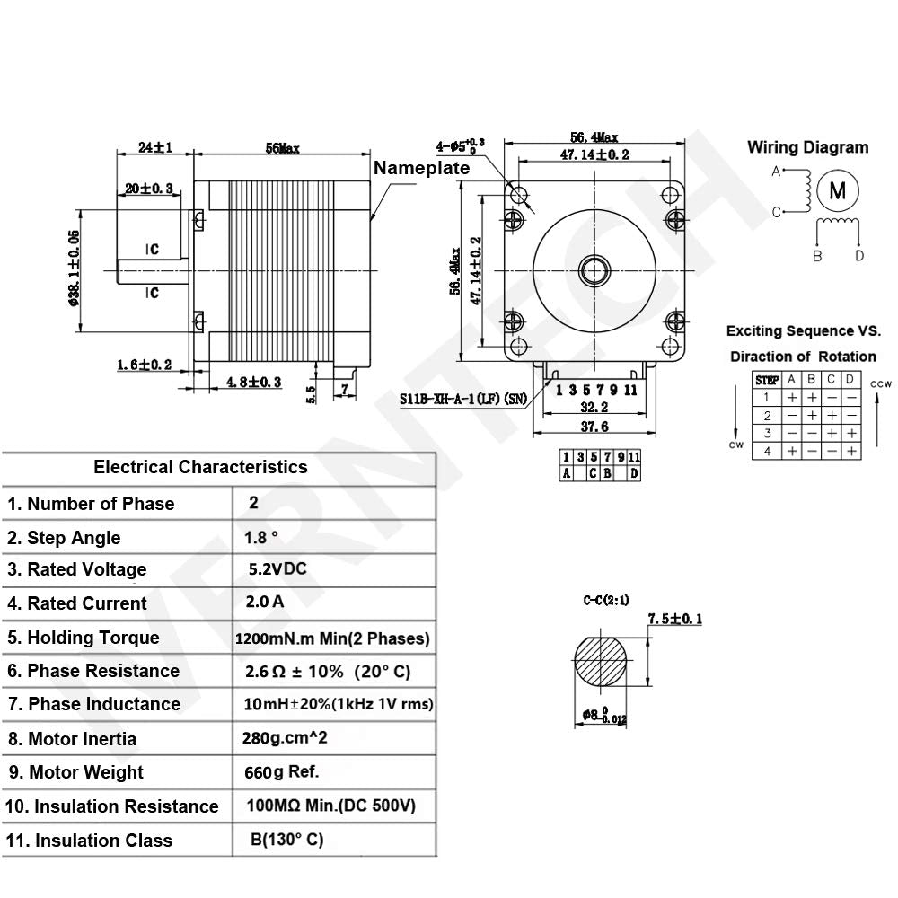 Iverntech 564Mm X 564Mm X 56Mm Nema 17 Stepper Motor Motor Type: Bipolar Stepper Number Of Phase: 2 Number Of Leads: 4 Step Angle: 18 Deg Rate Voltage: 52V Dc Rated Current: 20 A Holding Torque: 1200Mnm Min Phase Resistance: 26Ohmsa10%(20) Phase Inductance: 10Mha20%(1Khz) Rotor Inertia:280Gcm2 Item Weight: 660G Package List: 1 X 57-56Mm Nema 17 Stepper Motor 1 X 80Cm (3149) Motor Cable