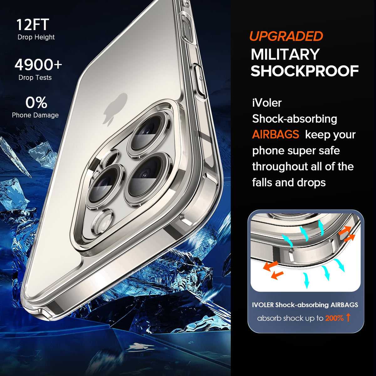 Q: What kind of protection does the case provide?A: The ivoler Clear Case offers military-grade protection with Cushion Tech that disperses shocks, a rigid polycarbonate backplane, and flexible TPU bumpers. It also has raised bezels to protect the screen and camera from drops and scratches.