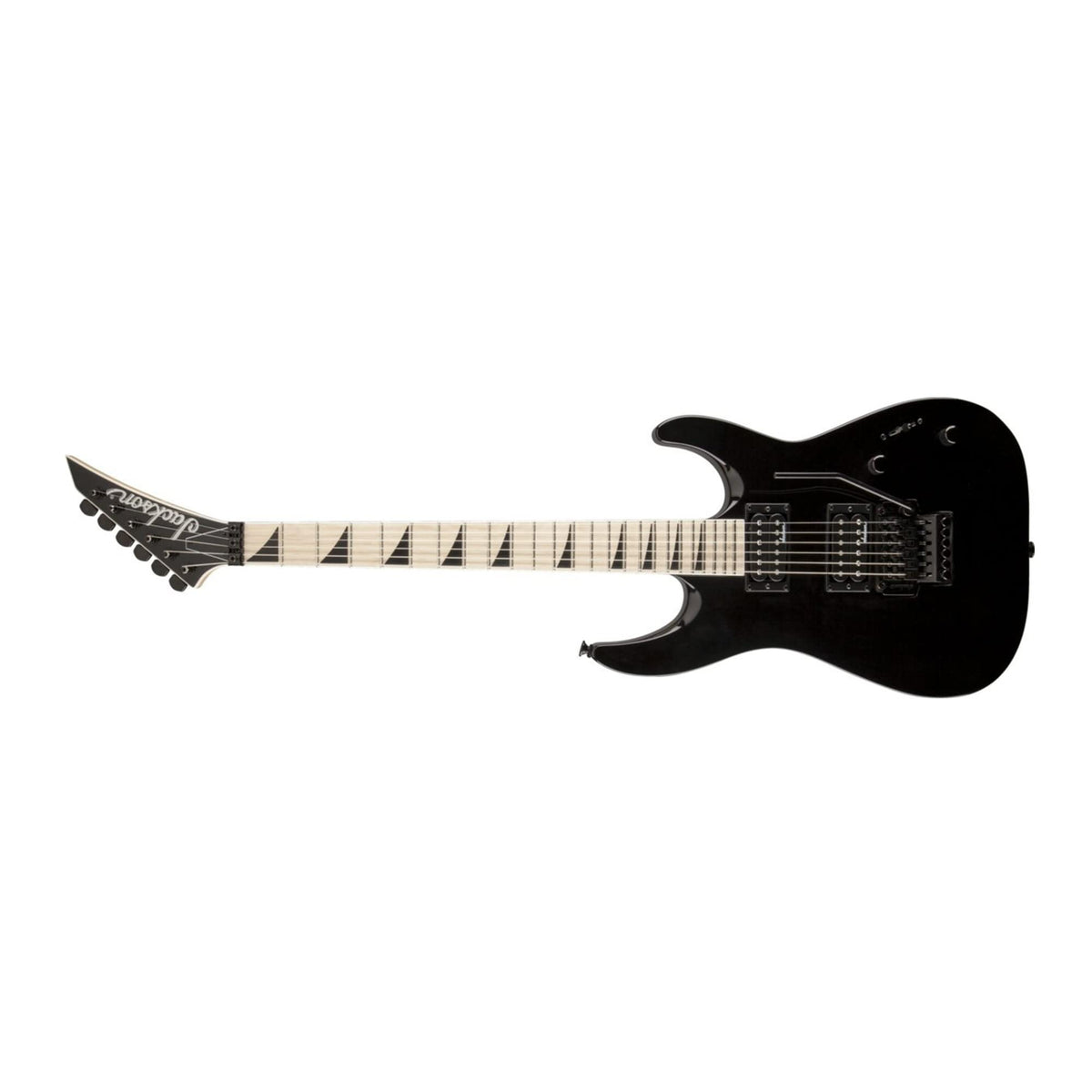 Q: What are the key features of the Jackson JS32 Dinky - Gloss Black?A: The Jackson JS32 Dinky - Gloss Black features a solidbody electric guitar design with a lightweight poplar body, a gloss black finish, and an arched top. It includes two high-output humbucking pickups for a powerful tone, a maple neck for fast playability, and a compound-radius fretboard that enhances chording and shredding without fret buzz.