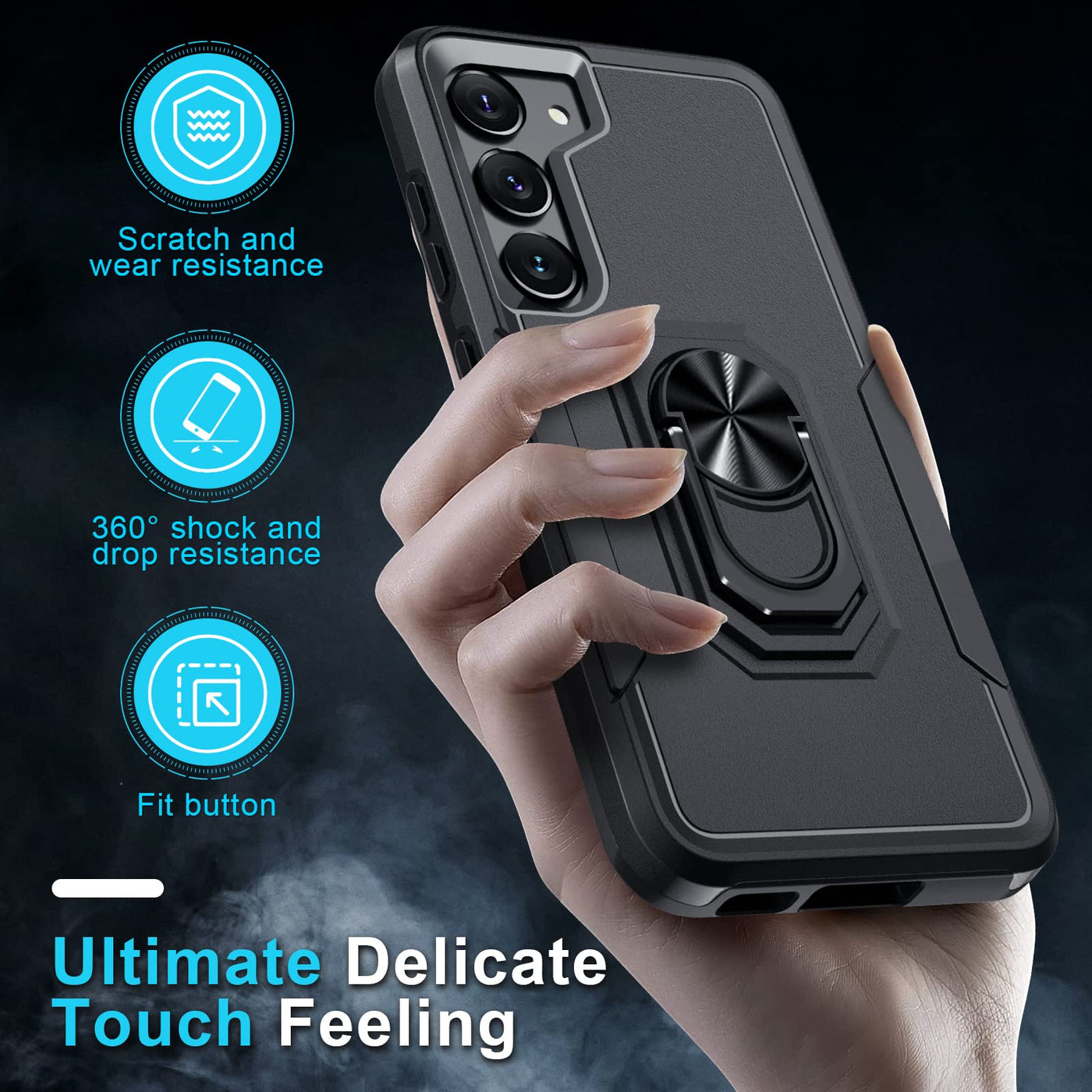 Janmitta Compatible With Galaxy S23+ Plus Case With Screen Protector+Camera Lens Protector,Heavy Duty Shockproof Full Body Phone Cover Built In Metal Ring Holder Kickstand,2023 Black Matte