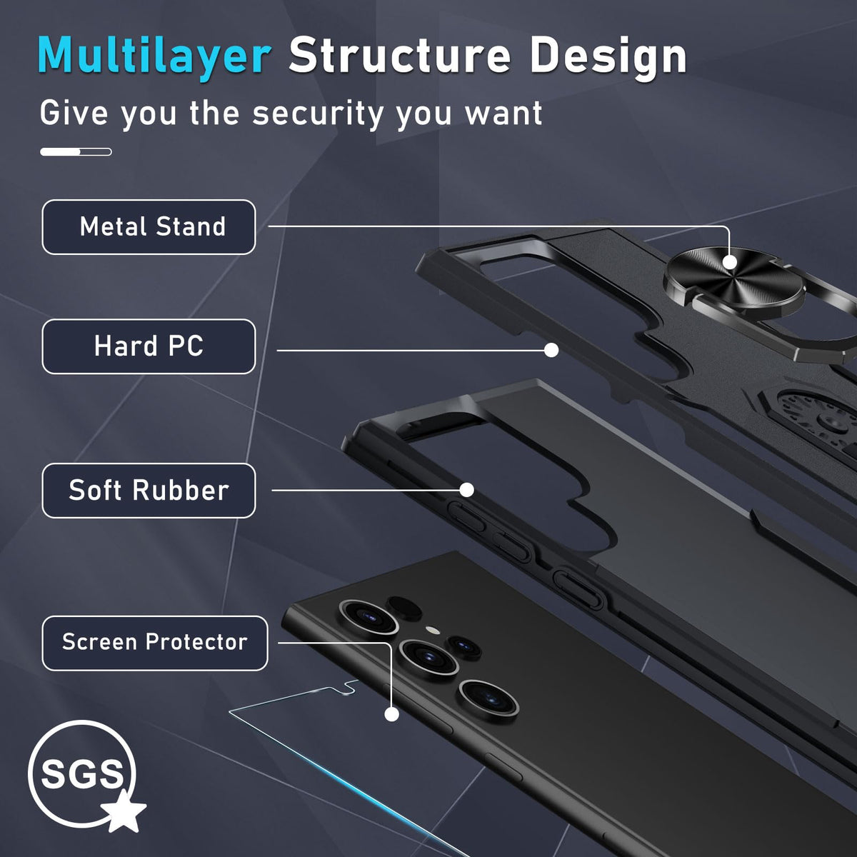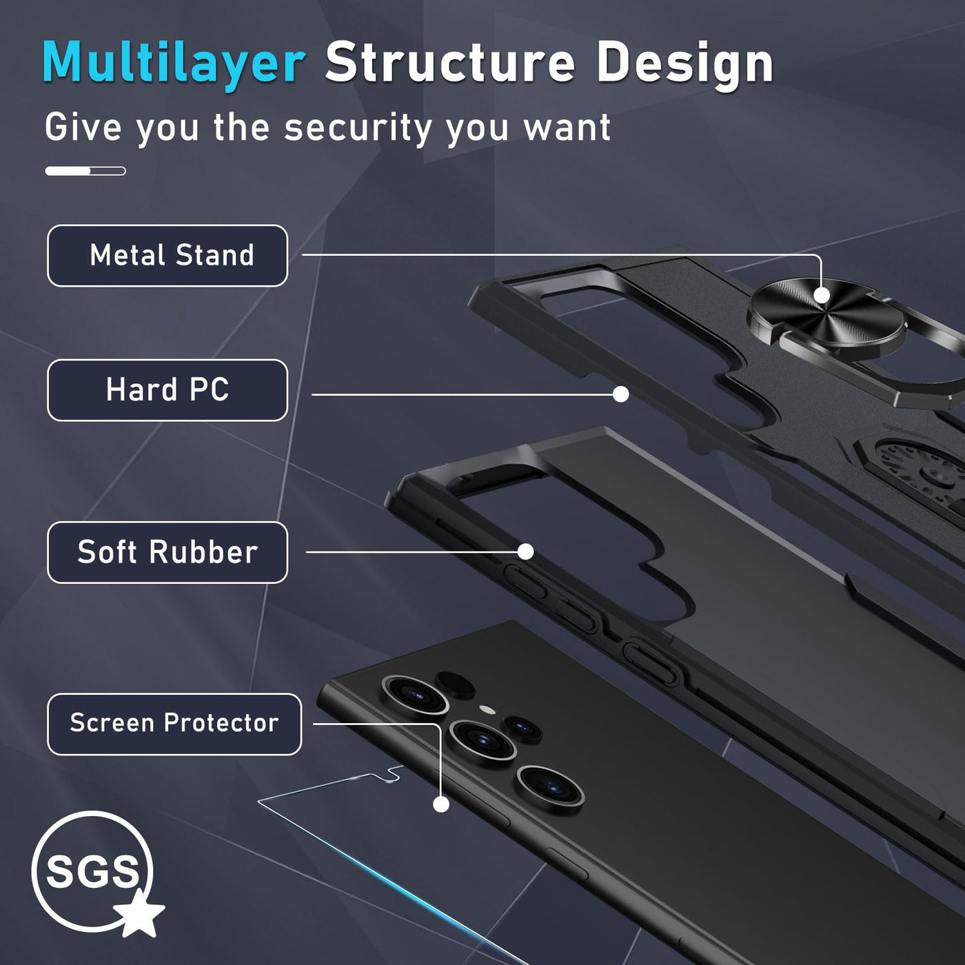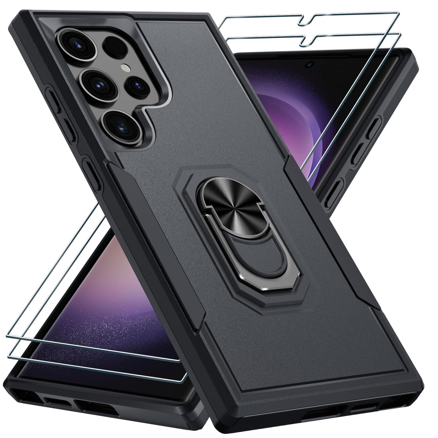 Janmitta Compatible With Galaxy S24 Ultra Case With Screen Protector[2 Pack],Heavy Duty Shockproof Full Body Protective Cover Built In Metal Ring Holder Kickstand,2024 Black Matte