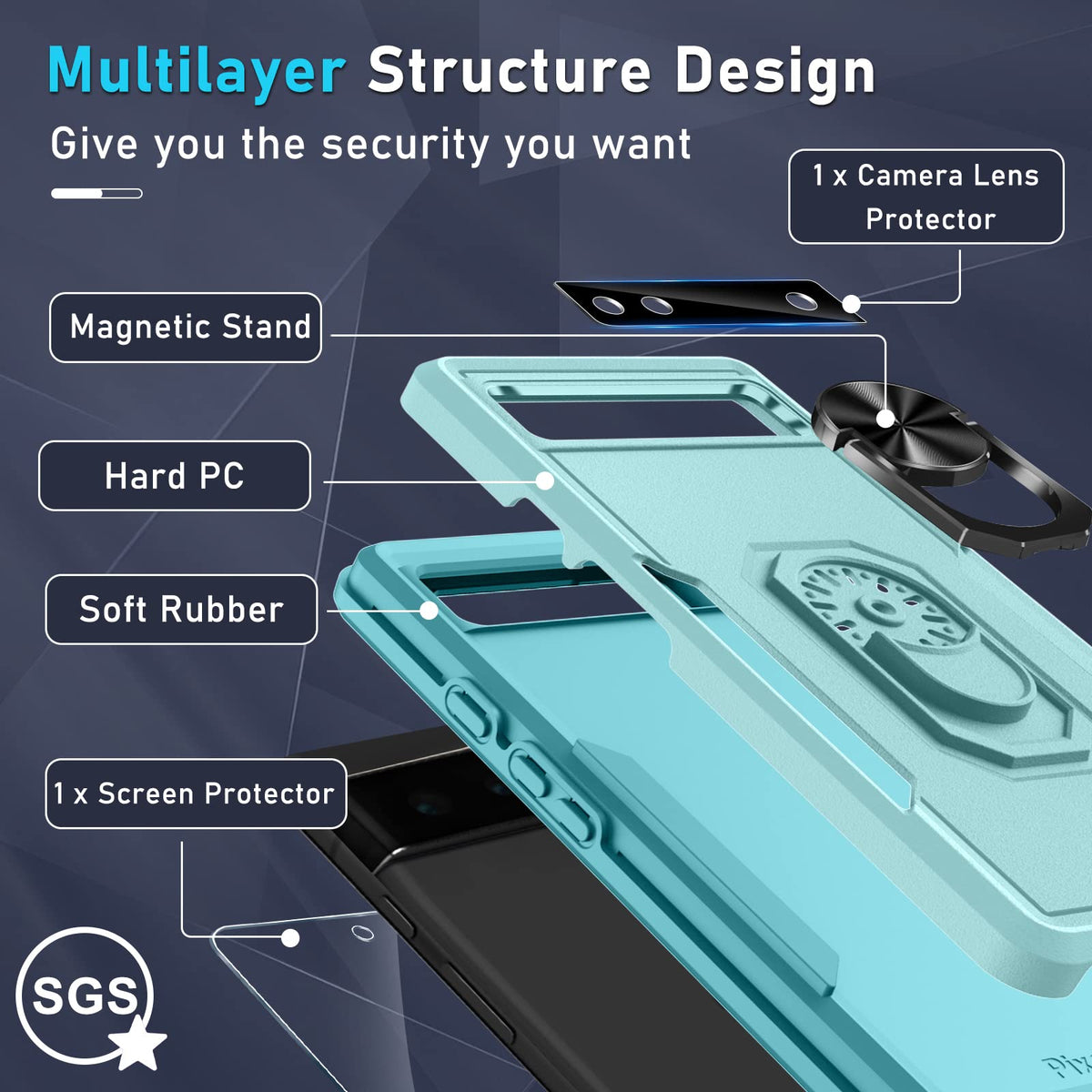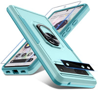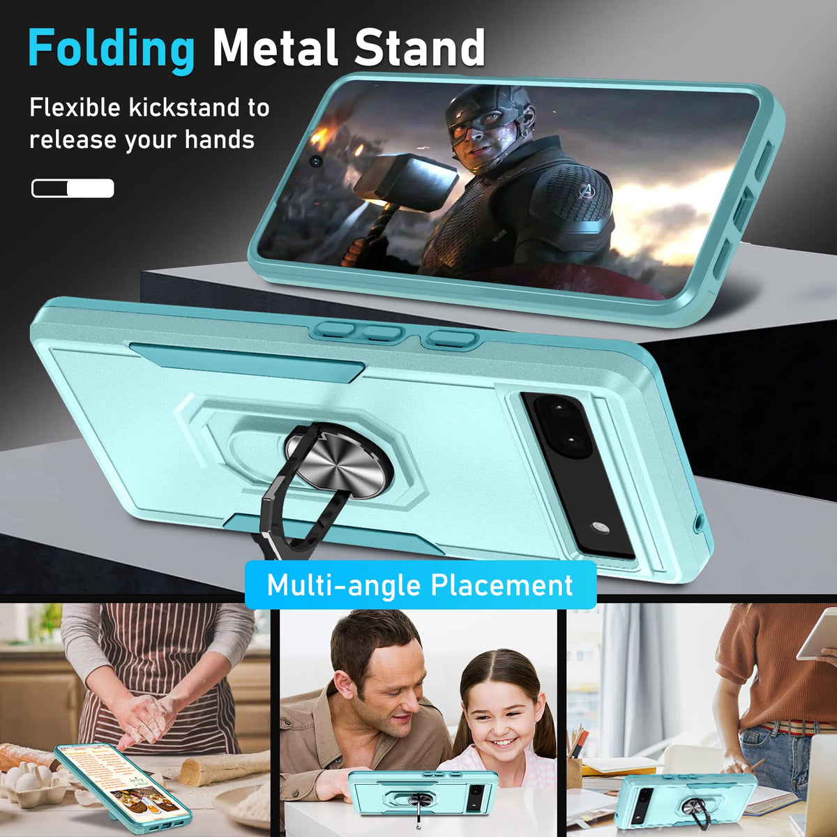 Janmitta For Google Pixel 6A Case With Screen Protector+Camera Lens Protector,Heavy Duty Shockproof Full Body Phone Cover,Built In Metal Ring Holder Kickstand,2022 Mint Green