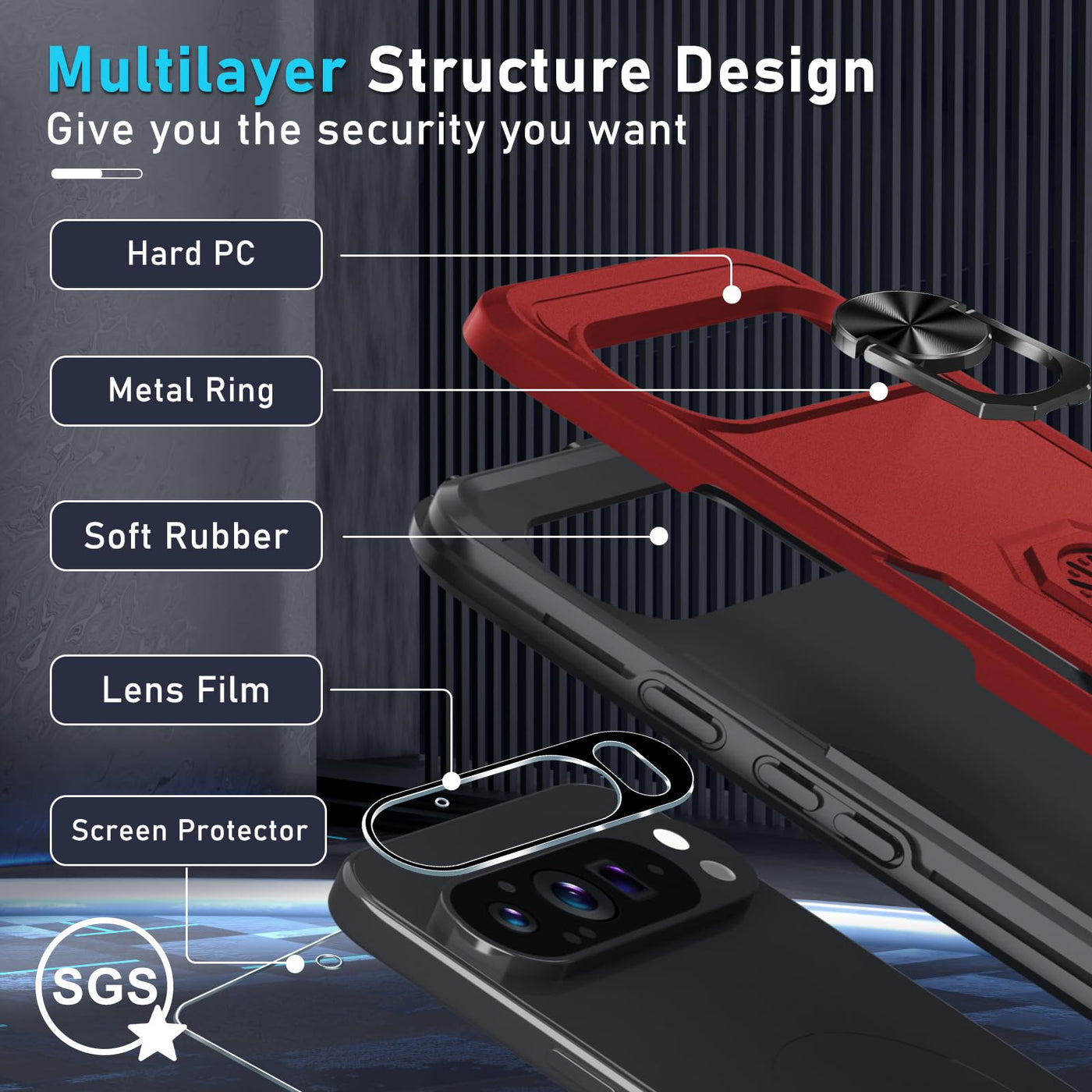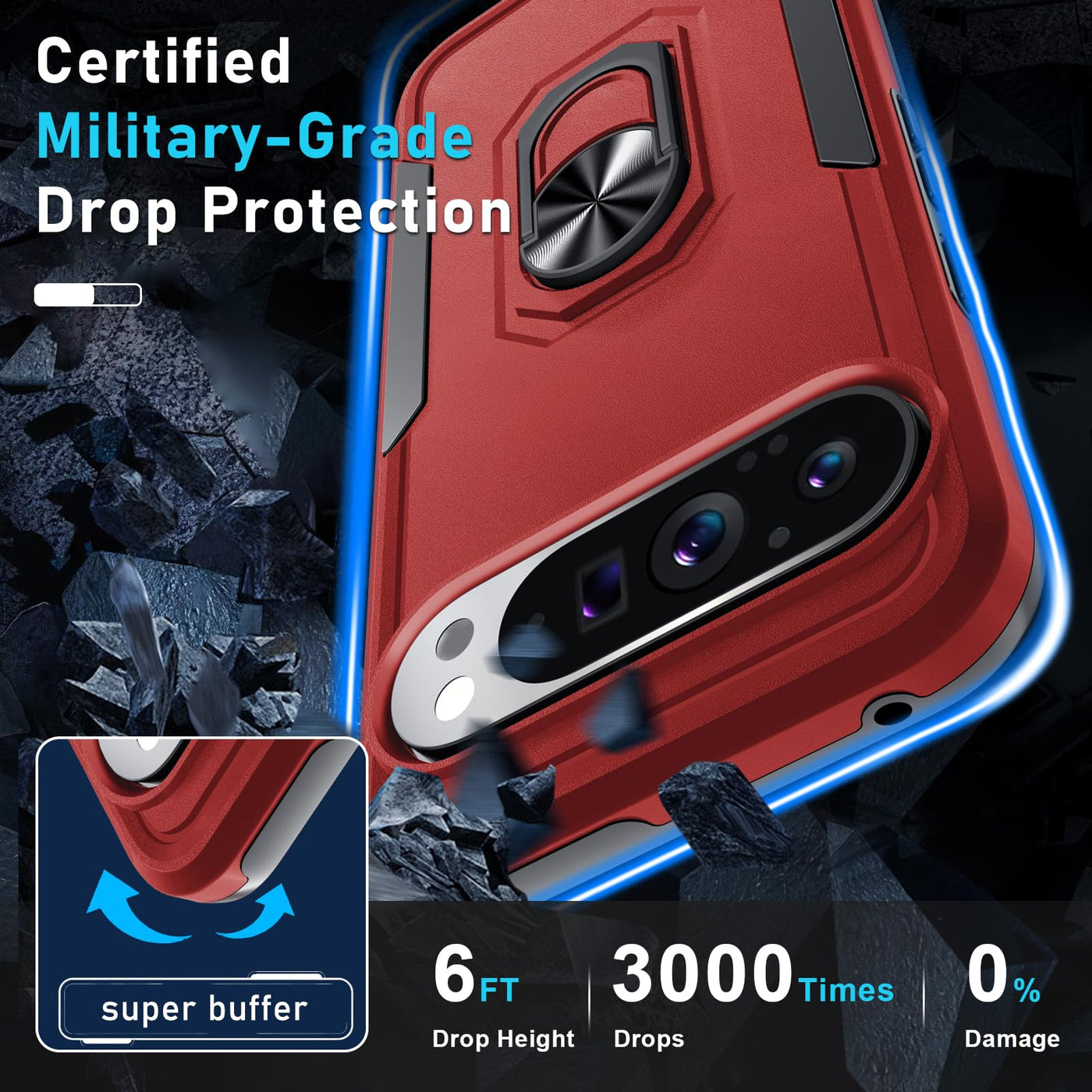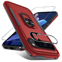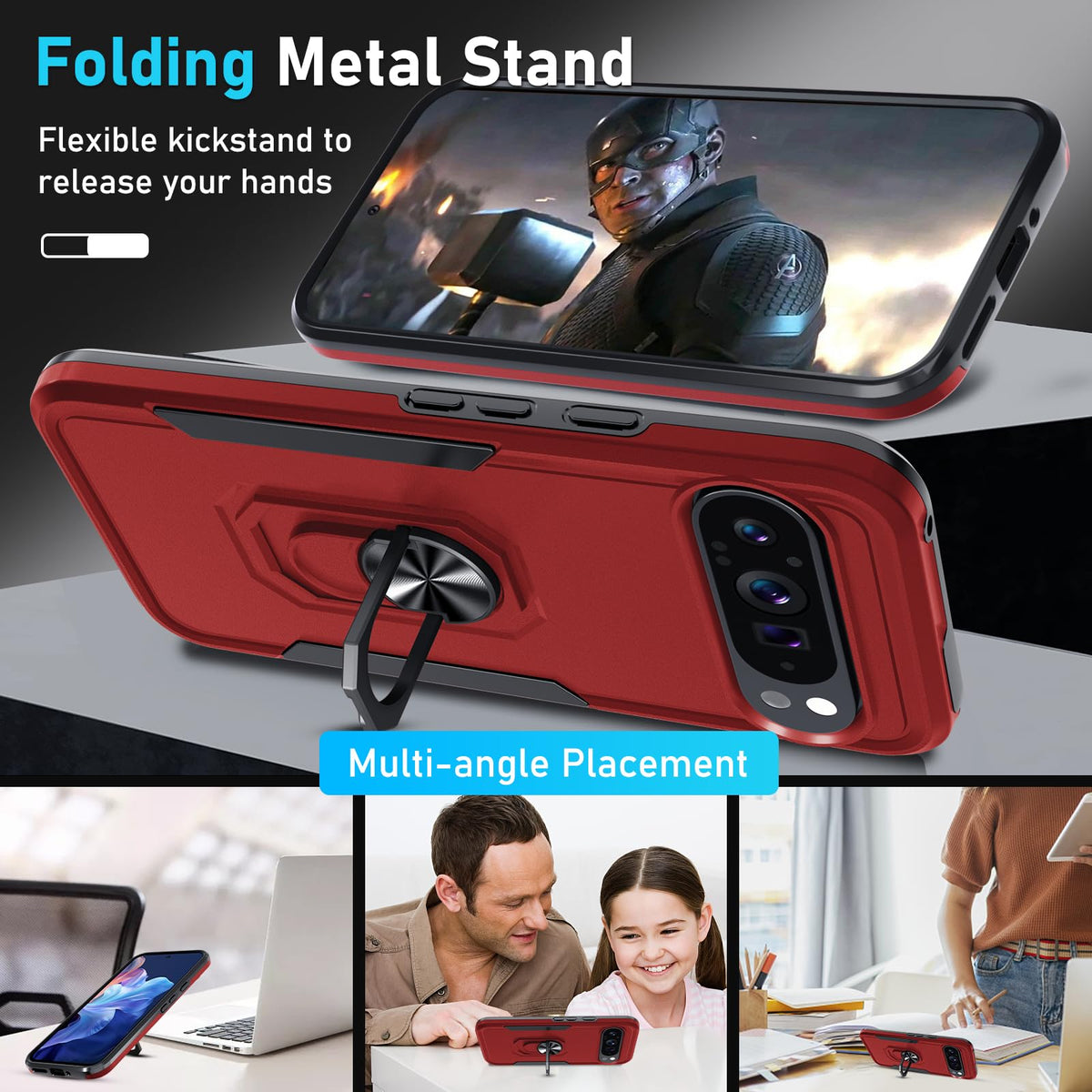 Janmitta For Google Pixel 9/9 Pro Case With Screen Protector+Camera Lens Protector,Heavy Duty Shockproof Full Body Phone Cover Built In Metal Ring Holder Kickstand,2024 Red