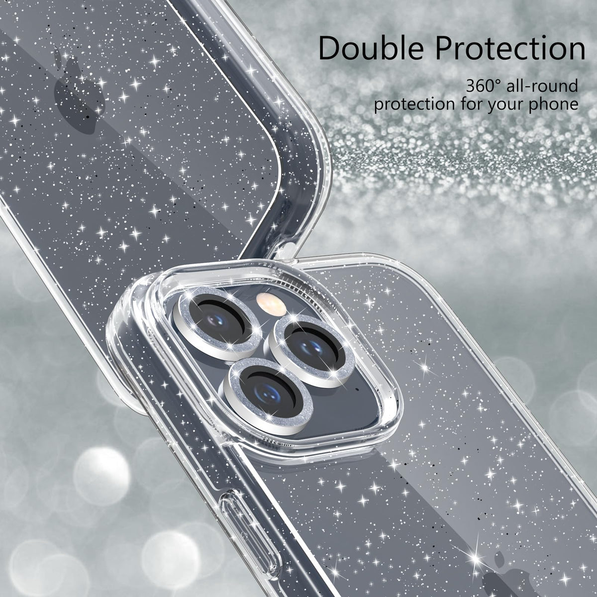 Jasmeas Design For Iphone 15 Pro Case Clear Glitter, With [2 Pack] Screen Protector & [3 Pack] Camera Lens Protector Sparkle Pc Hard Soft Tpu Silicone Bumper Cute Phone Cases For Women Girls (Clear)
