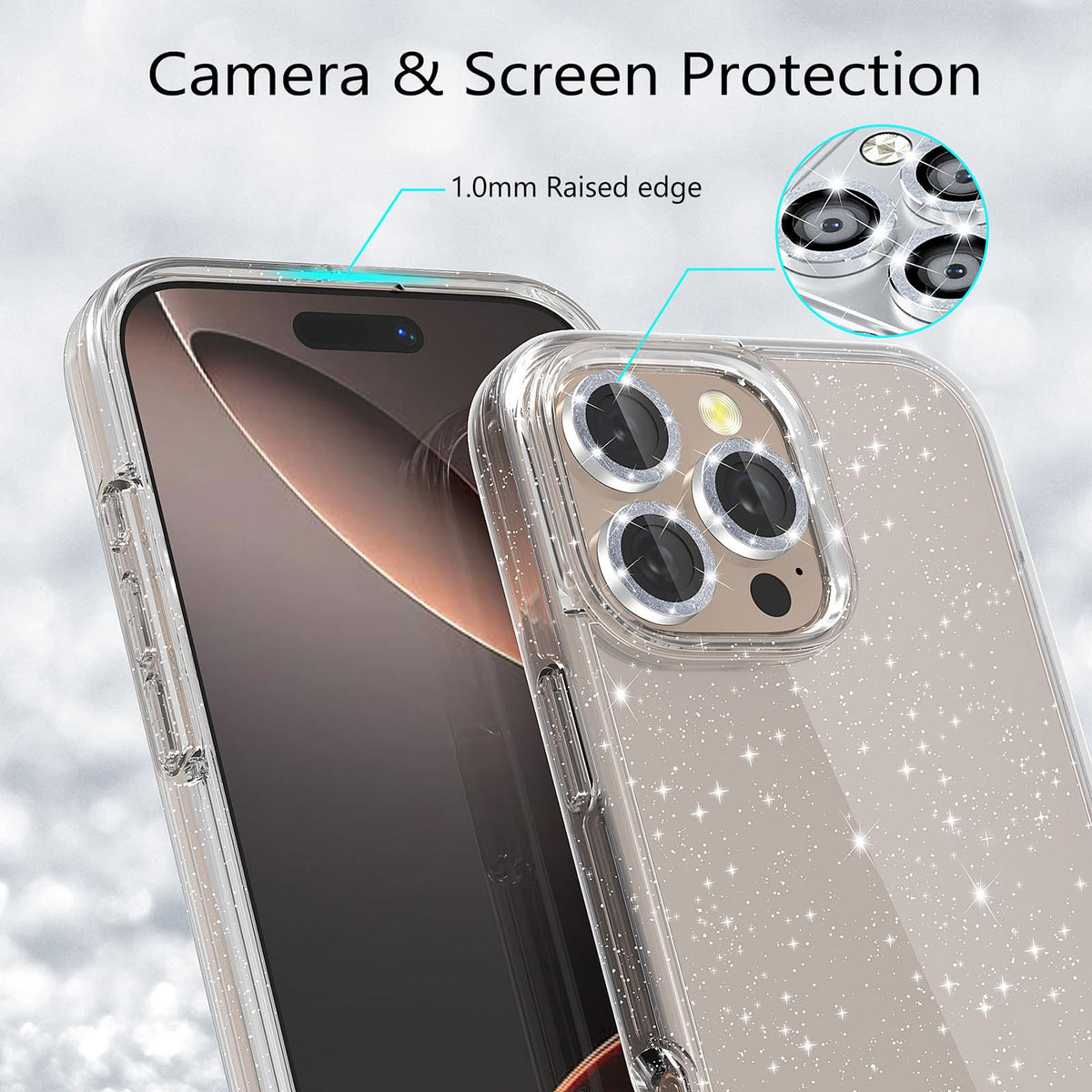 Jasmeas For Iphone 16 Pro Max Case Clear Glitter, With [2 Pack] Screen Protector & [3 Pack] Camera Lens Protector Sparkle Pc Hard Soft Tpu Silicone Bumper Cute Phone Cases For Women Girls (Clear)