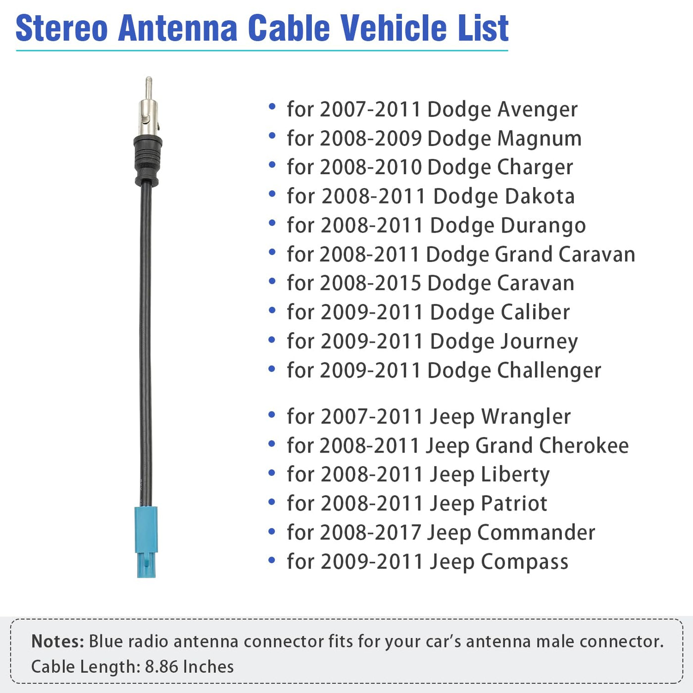 Product Package 1 X Car Radio Antenna Adapter Stereo Antenna Cable Replacement For For 2007-2011 Dodge Avenger For 2008-2009 Dodge Magnum For 2008-2010 Dodge Charger For 2008-2011 Dodge Dakota For 2008-2011 Dodge Durango For 2008-2011 Dodge Grand Caravan For 2008-2015 Dodge Caravan For 2009-2011 Dodge Caliber For 2009-2011 Dodge Journey For 2009-2011 Dodge Challenger For 2007-2011 Jeep Wrangler For 2008-2011 Jeep Grand Cherokee For 2008-2011 Jeep Liberty For 2008-2011 Jeep Patriot For 2008-2017 Jeep Commander For 2009-2011 Jeep Compass Notes: Blue Radio Antenna Connector Fits For Your Cars Antenna Male Connector. Cable Length: 8.86 Inches