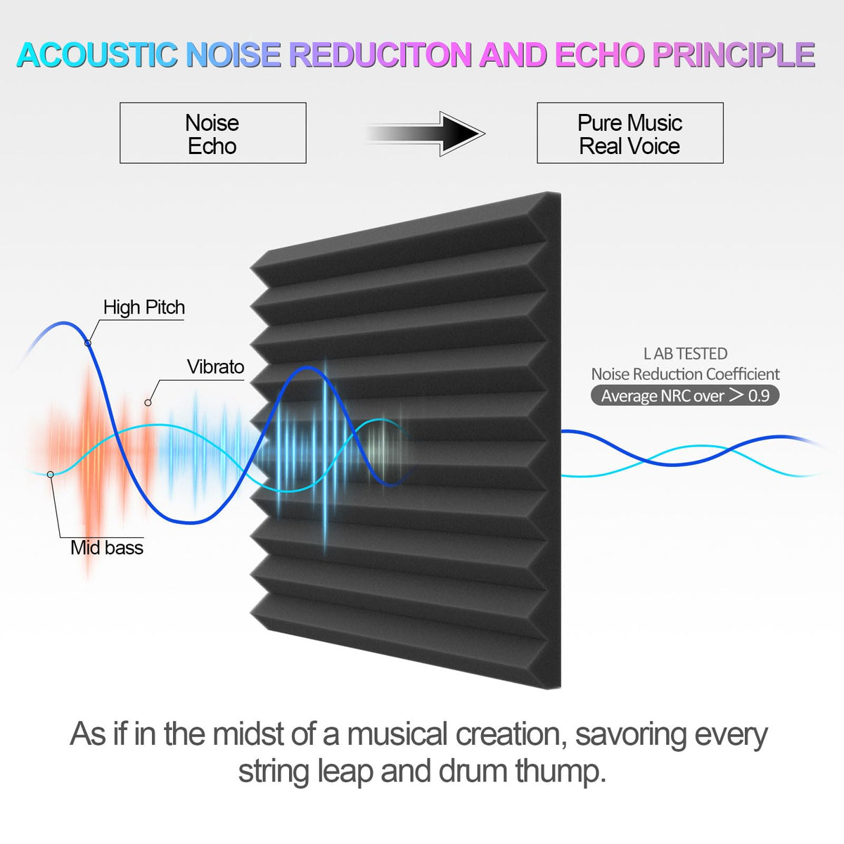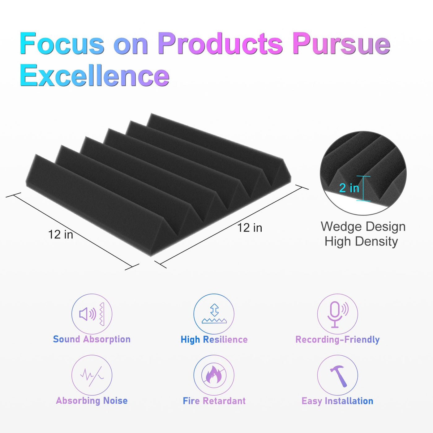 Professional Studio Grade Acoustical Treatments, Create Beautiful Recording Environments! Acoustic Foam Is Used To Remove Reverberation And Sound Reflections, Provide Sound Insulation Industrial And Domestic Applications Suitable For Sound Studios. Unlike Polyurethane Foam, Fiberglass And Rock Wool Have Health Risks. This Product Can Be Used As Acoustic Cover For Walls, Ceilings And Doors And Other Various Places Such As Theaters Or Movie Theaters, Recording Studios, And Other Busy And Crowded Places Such As Gyms, Subways, Stations, Offices, Schools, And Other Areas. This Product Is Great For Voice And Video Recording. Effective Sound Deadener For Standing Waves And Flutter Echoes, Especially When Used With Our Corner Bass Traps And Corner Blocks. It Also Reduces Slap-Back And Room Ring When Used In Medium-Sized Areas Like Isolation Booths, Recording Booths, Control Rooms, And Sound Studios. Use For Decoration Or Professional Applications. This Foam Is Ideal For Spot-Treating Production Studios, Practice Rooms Or Home Entertainment Centers. Also, This Foam Helps With Smaller Agitation Echo Complications. For Decorative Purposes, Wedges, Eggcrates And Pyramids Can Also Be Arranged Side-By-Side With The Acoustic Bass Traps, Corner Bass Traps Triamp And Other Bass Acoustic Foam. How Much Space Does One Tile Cover? 2'' X 12'' X 12'' Acoustic Panel Studio Foam Wedges Are 2 Inch In Thick And Covering 1 Square Foot. If You Purchase A 12 Pack Of 2'' X 12'' X 12'', That Would Cover 12 Square Feet. If You Purchase A 48 Pack Of 2'' X 12'' X 12'', That Would Cover 48 Square Feet. And So On. Foam Will Not Deteriorate Or Fall Apart Over Time. All That Is Required Is Dusting Over Long Periods Of Time.