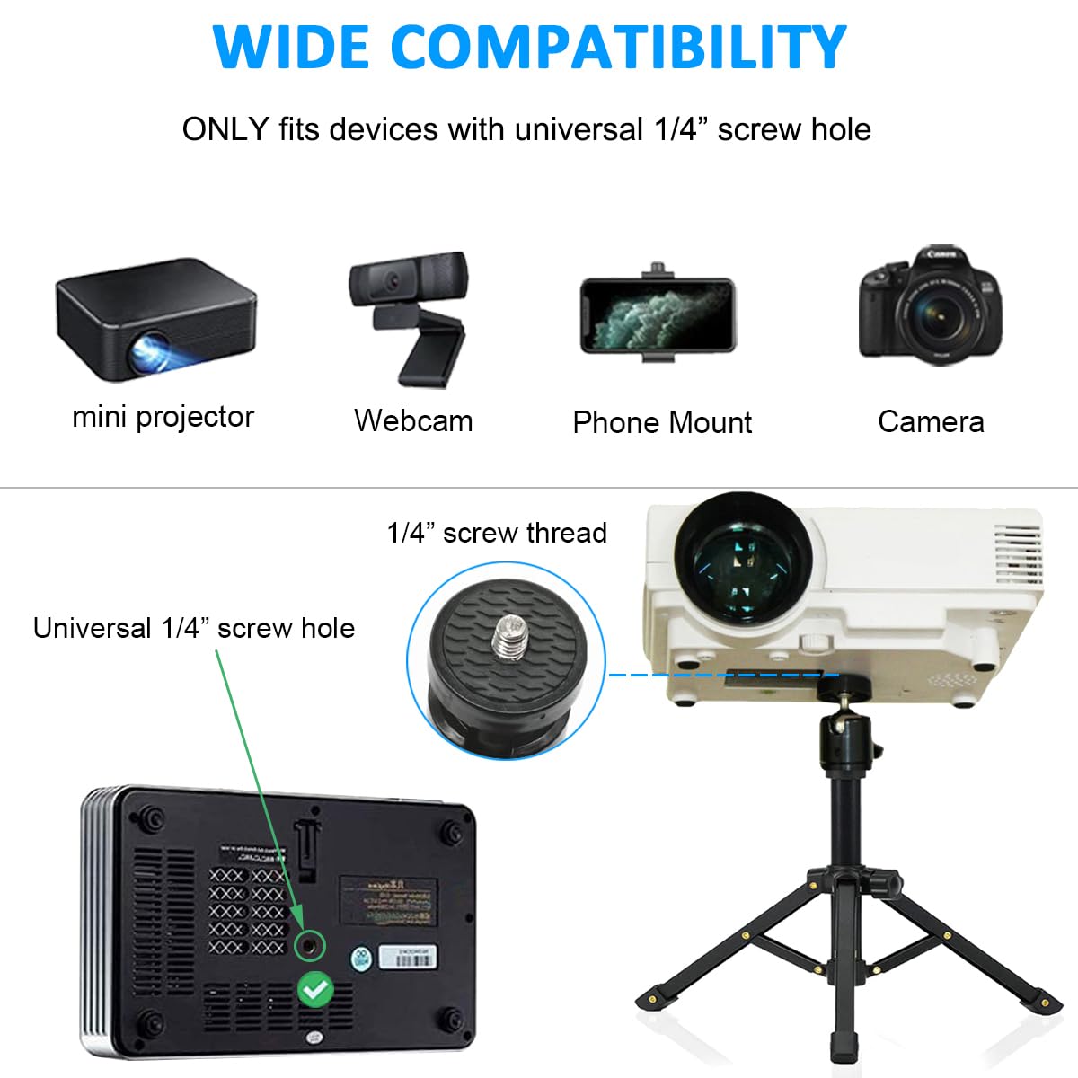 With Jcwiny Multifunctional Projector Tripod Stand, Setting Up A Theater In Your Home At Ease. With Max Height Of 8.5 Inches To Support Your Mini Projector For A Complete Home Theater Experience. With Ball Head To Rotate 360� Horizontally And Tilts A Maximum Of 135� For Various Projecting Or Shooting Angles. With A Universal 1/4' Screw, The Tripod Is Fits The Majority Of Digital Devices, Such As Projector, Dslr Cameras, Webcams, Phone Clamps, Microphone, Camcorders, And Other More Devices.