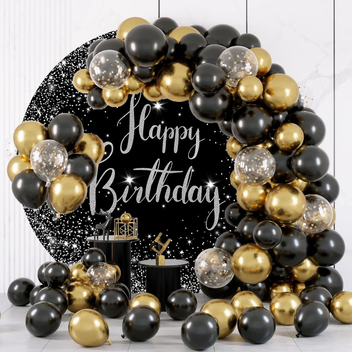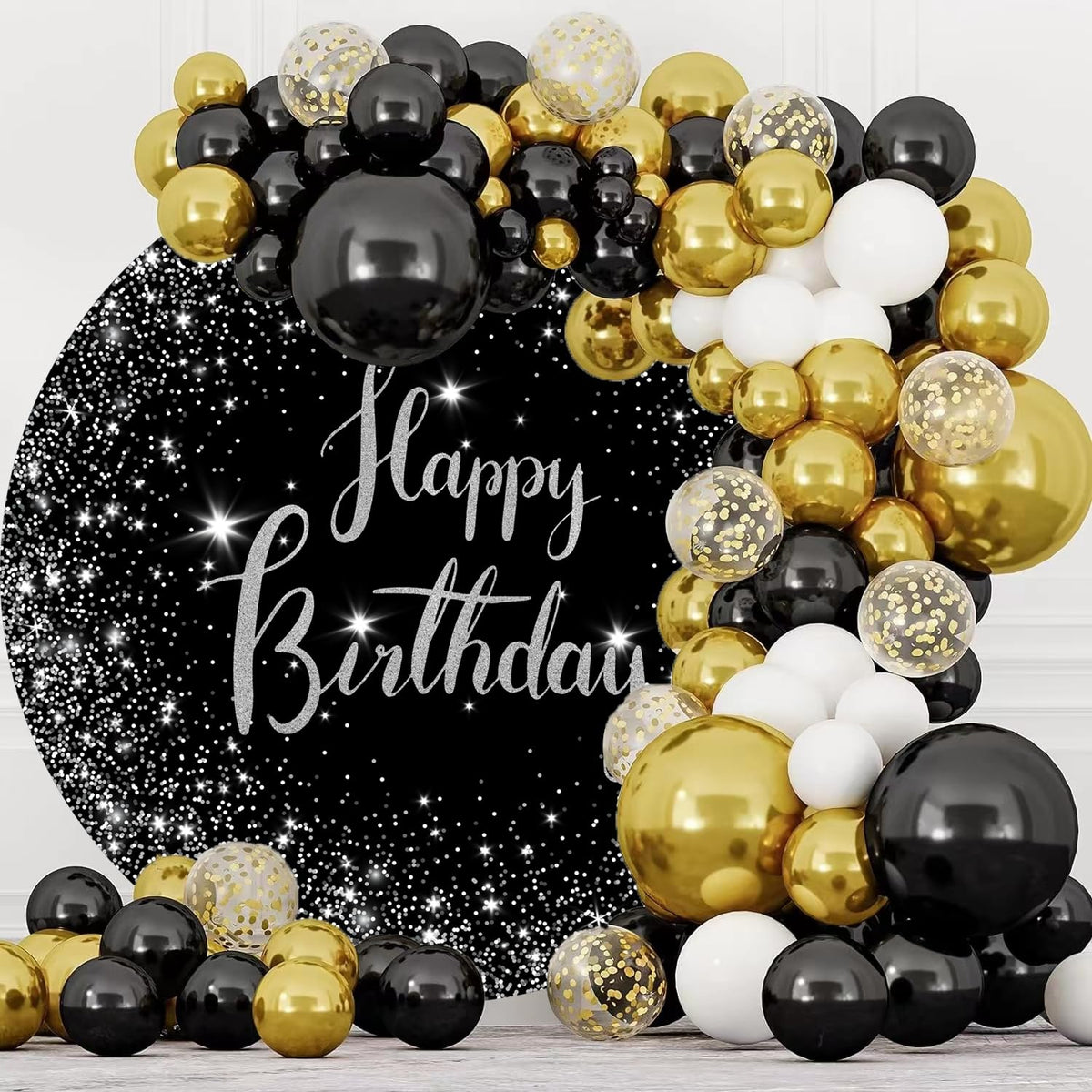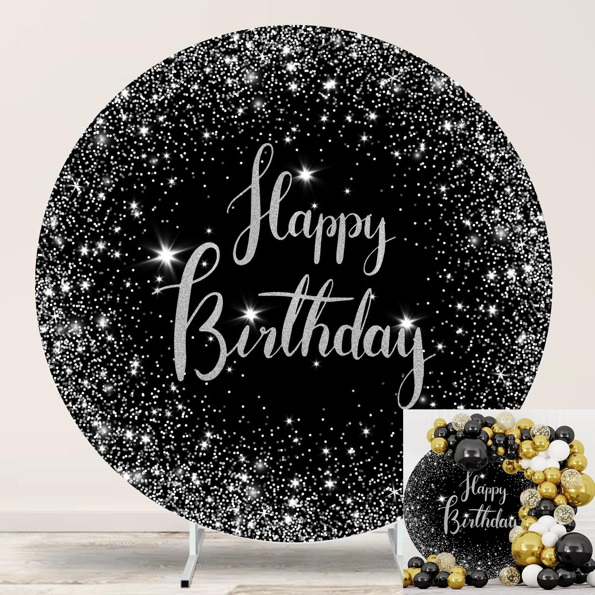 Jditngp 7.2Ft Happy Birthday Round Backdrop Cover Black And Silver Birthday Circle Photography Background Glittering Stars Diamo
