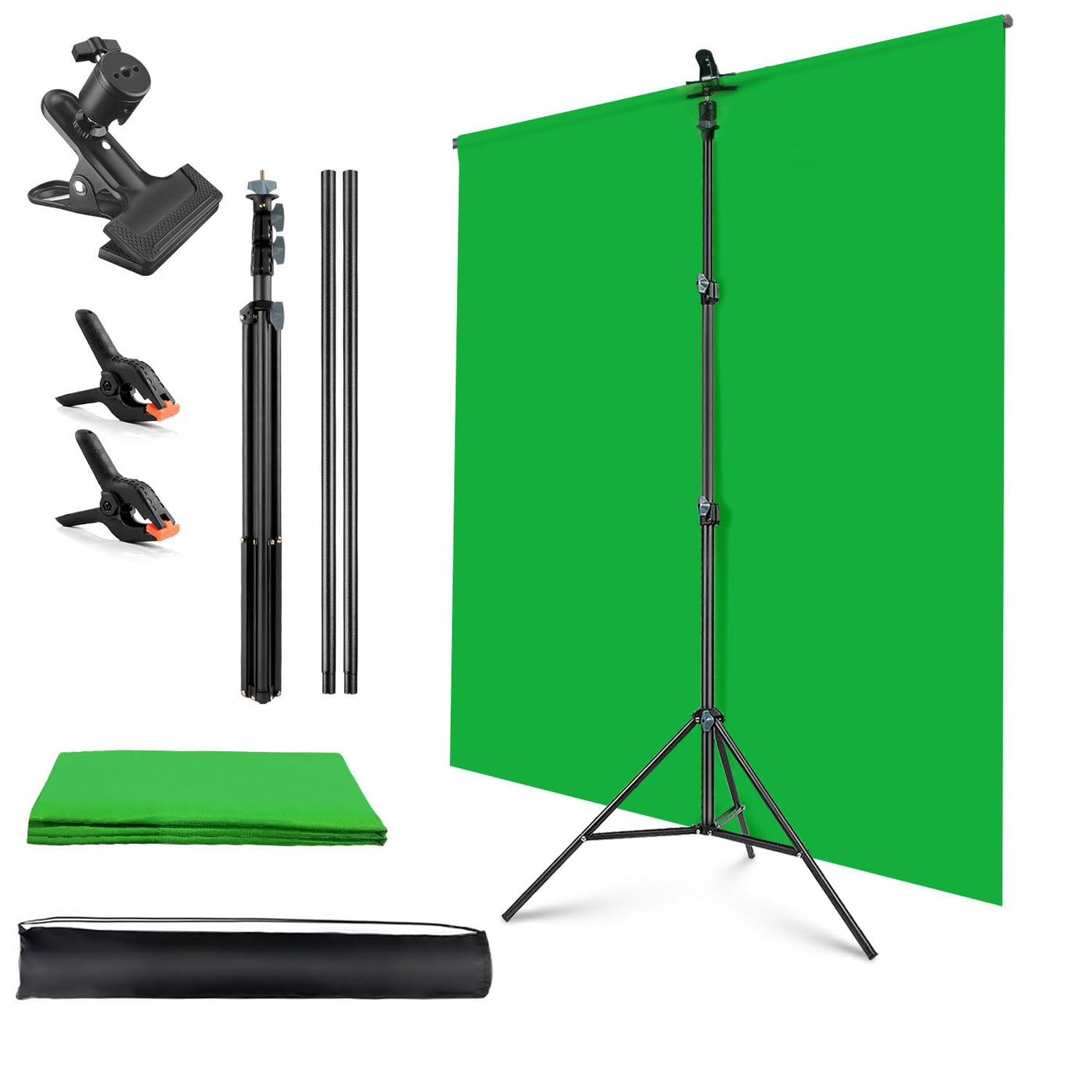 Package Content [1 X ] Tripod Stand, 2X Crossbar, [1 X ] Green Backdrop, [ 2 X ] Backdrop Clip, [1X ] Carrying Bag, [1 X ]Heavy Duty Metal Clamp Holder