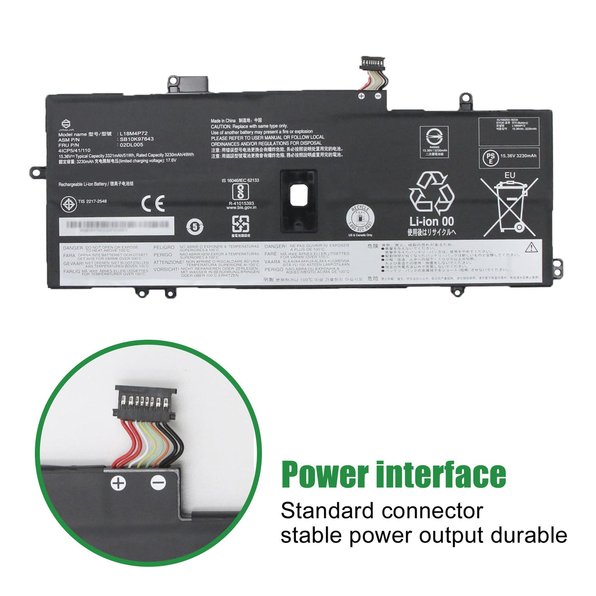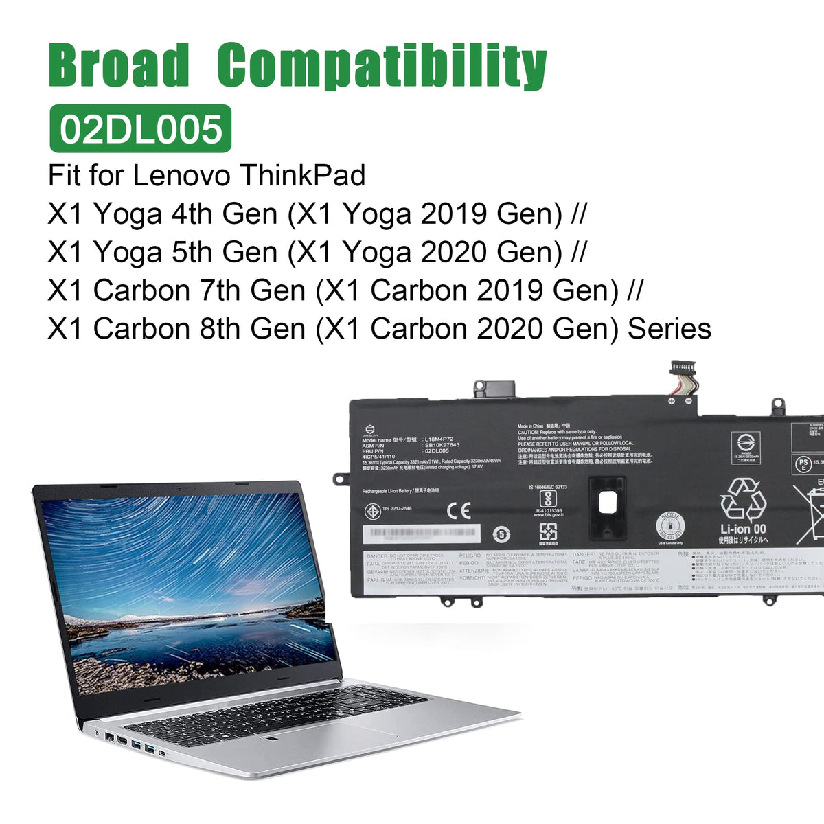 .Type: Plug & Play Rechargeable Li-Ion Battery .Model: 02Dl005 .Voltage: 15.36V .Capatity: 51Wh 3321Mah .Interface: Refer To The Picture! Please Check It! .Color: Black .Replacement For Part Number: 02Dl005 L18M4P72 Sb10K97643 02Dl006 L18C4P71 Sb10K97644 02Dl004 L18L4P71 Sb10K97642 5B10W13930 5B10W13931 5B10W13932 .Compatible Models (Use ''Ctrl+F To Find Your Model Quickly'') Fit For Lenovo Thinkpad X1 Yoga 4Th Gen (X1 Yoga 2019 Gen) Series Fit For Lenovo Thinkpad X1 Carbon 7Th Gen (X1 Carbon 2019 Gen) Series Fit For Lenovo Thinkpad X1 Carbon 8Th Gen (X1 Carbon 2020 Gen) Series Not All The Compatible Laptop Models Have Been Listed, Please Open The Back Case Of Your Laptop And Choose The Right Battery Model According To Your Laptop'S Origibal Battery. .Package Included: 1X 02Dl005 Battery 1X User Manual 1X Tool Kit .Note: 1.Before Placing Your Order, We Highly Suggest You To Open The Back Case Of Your Latptop And Check Out The Exact Part Number Of Your Laptop'S Original Battery. 2.Discharge The New Battery Use To 5%(Not To 0%) And Then Charge To 95%, And Cycle 3-4 Times. 3.Do Not Disassemble, Crush Or Puncture. Do Not Dispose Of In Fire Or Water. 4.If You Remove Battery For A Long Time, Charge More Than 80% At Least One Time Within One Months. 5.Don'T Connect Adapter For A Long Time While Using The Battery. It May Damage The Battery. 6.When Using The Battery, Care Should Be Taken To Prevent Exposure And Moisture.
