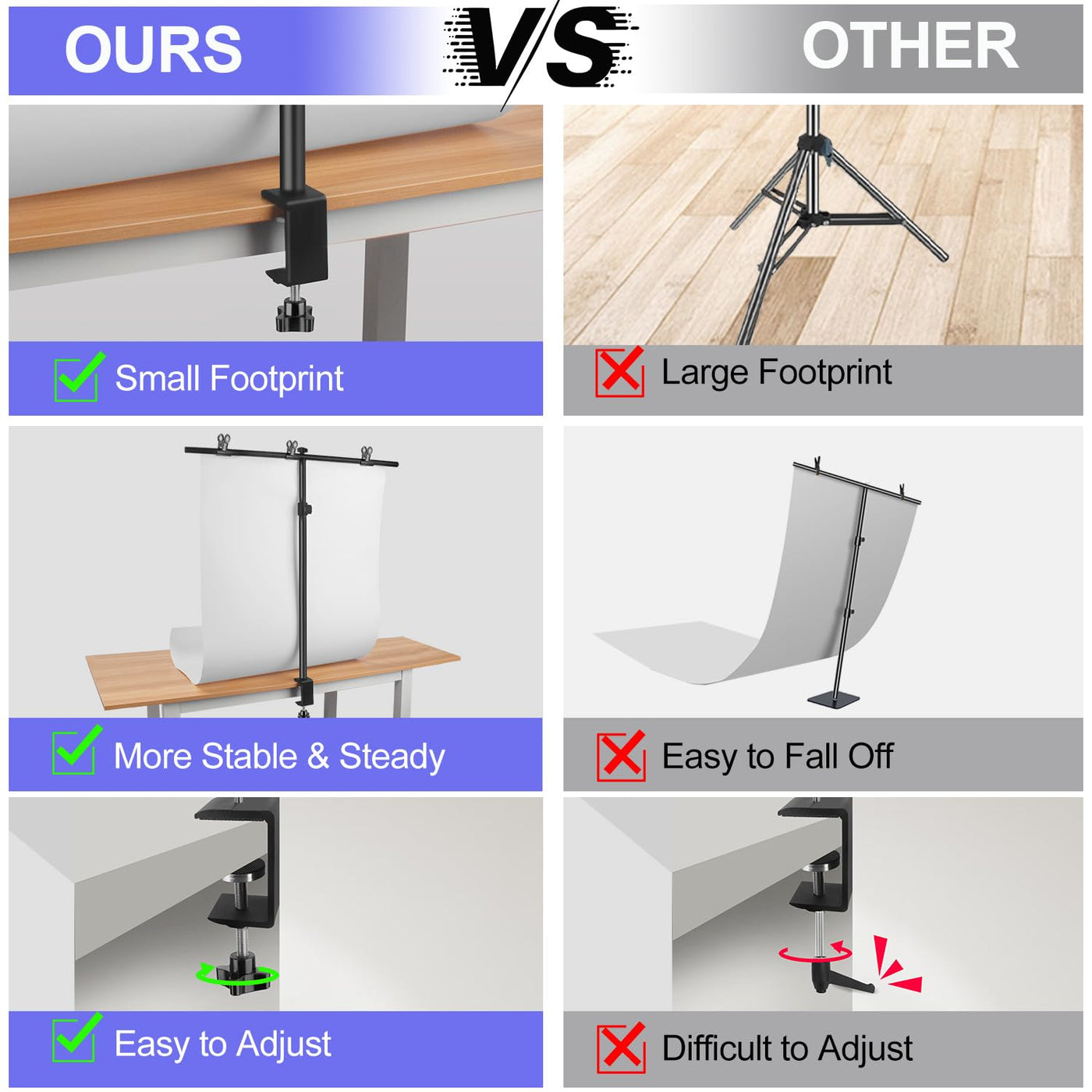 Q: Can I use the backdrop stand for both tabletop and larger backdrops?A: Yes, the Small Backdrop Stand is versatile and can be used for tabletop photography as well as for hanging larger backdrops, making it ideal for various setups.
