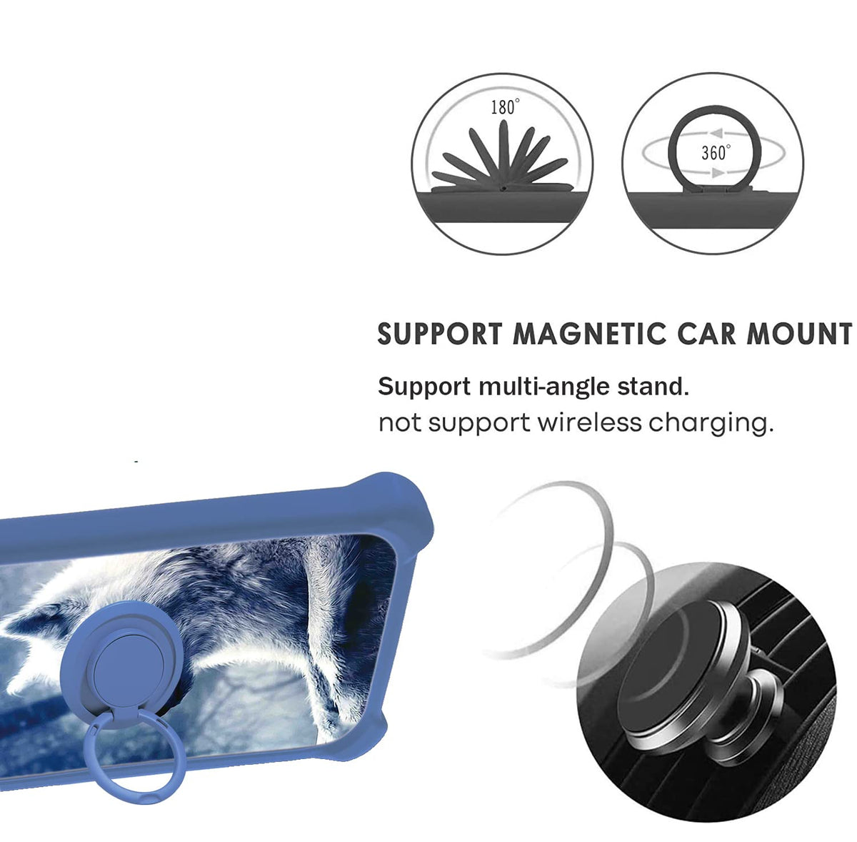 Q: What materials are used in the construction of this phone case?A: This phone case is made from a combination of PC hard back panel, soft silicone frame, and a metal support finger ring. This design provides durability and protection for your device.