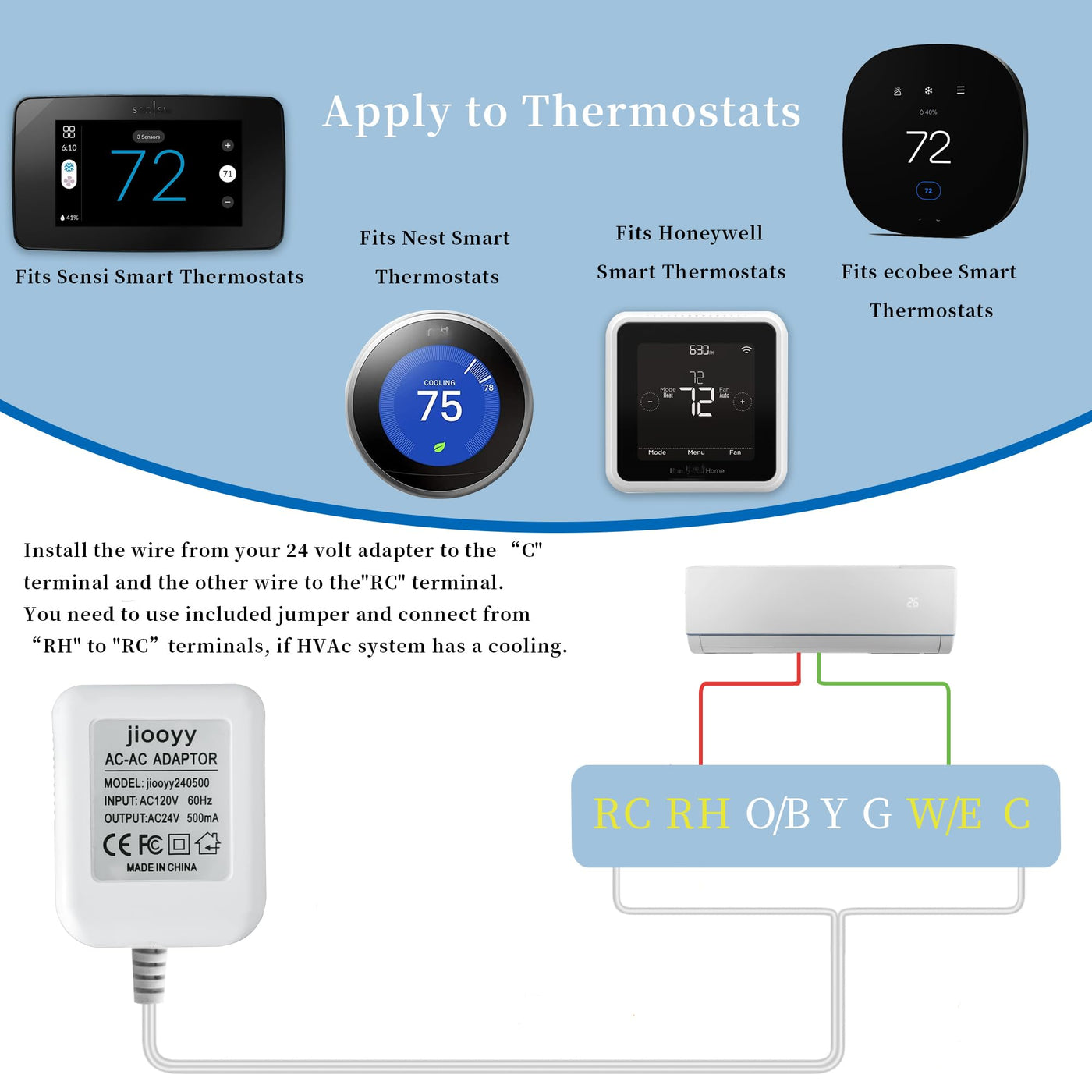 Q: Can this power adapter be used for thermostats as well?A: Yes, the Jiooyy 24V power adapter can be used for thermostats. For installation, ensure the circuit breaker is turned off, connect the appropriate wires to the 'C' and 'RC' terminals of the thermostat, then power it on.