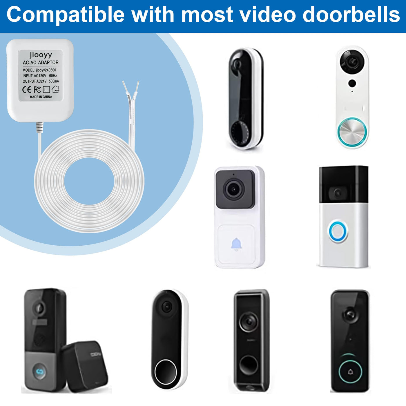 Q: What devices are compatible with the Jiooyy 24V 500mA Doorbell Power Adapter?A: The Jiooyy 24V 500mA Doorbell Power Adapter is compatible with popular smart doorbells like Ring Video Doorbell, Ring Video Doorbell 2, Skybell Doorbell, and smart thermostats including Honeywell Smart Wifi Thermostat, Ecobee, and Sensi.