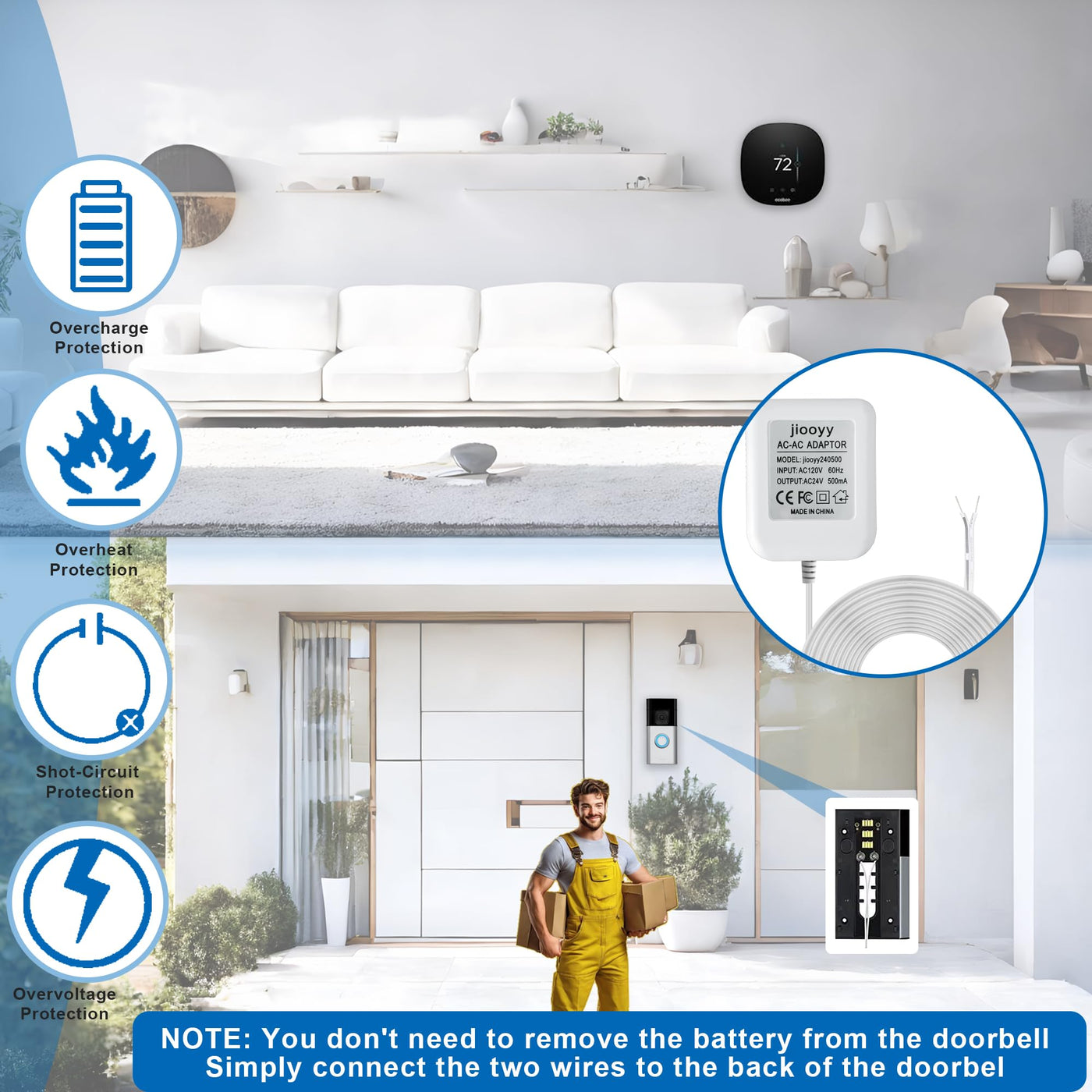 Q: What should I check before purchasing this power adapter?A: Before purchasing the Jiooyy Doorbell Power Adapter, confirm that the voltage and current requirements of your doorbell or thermostat match the specifications of this power supply to avoid any compatibility issues.