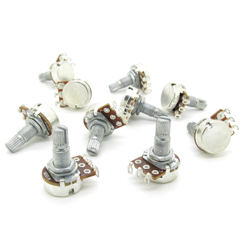 100% Brand New,Never Used High Quality Audio-Taper Potentiometers,Perfect For Replacing And Upgrading Audio Controls. A10K-Ohm Mini Control Pot The A Pot Is Usually Used For Volume Pot Split Shaft With Coarse Knurling Coarse Knurled Shaft Fits Most Control Knobs Shaft Diameter:Approx.6Mm Shaft Length:Approx.18Mm Base Diameter:Approx. 16.5Mm Resistance:10K Ohm Package Included:10Pcs X A10K Guitar Potentiometers