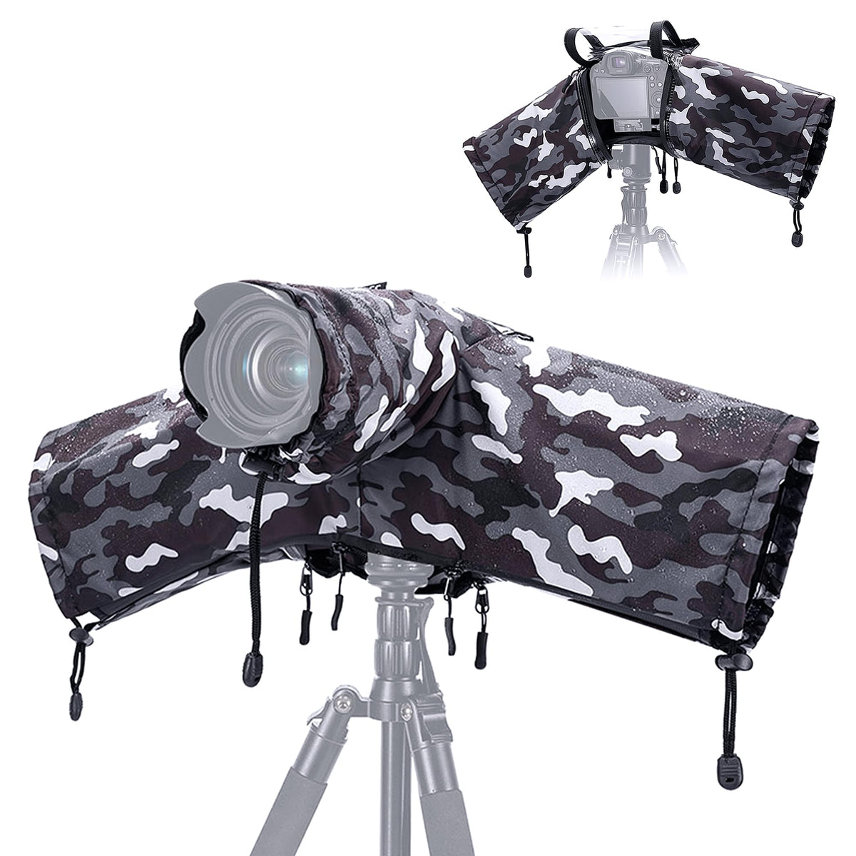 Q: How does the rain cover protect my camera from the elements?A: This rain cover is made from double-layer lightweight waterproof nylon fabric, providing reliable protection against rain, snow, salt spray, dust, and dirt. It features cinchable sleeves for easy access to camera functions while keeping your equipment safe.